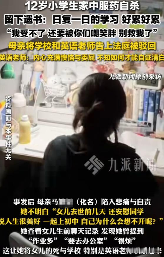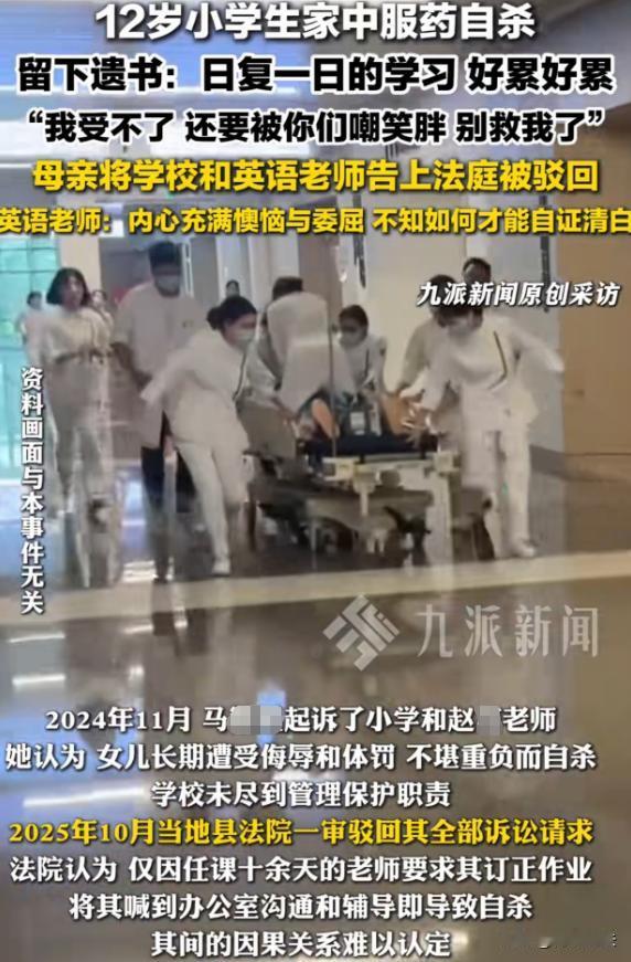 江苏,有个12岁上六年级的女孩,感冒引发肠胃炎输了液,原本以为只是小病一场,可谁能料到,她竟吃了外婆服用的100粒药自 杀了,外婆发现时,她脸色青紫,还留了遗书,这遗书里的内容,让所有人都揪心不已。 母亲马女士接到消息赶回家,看到女儿的状况,她认定是英语老师侮辱体罚女儿,才让女儿走上绝路。 原来,女孩遗书里说学习太累,英语单词怎么写都记不住,作业没完成就被叫办公室,回家还被父母嘲笑胖,实在受不了。 马女士越想越气,一年后把学校和老师告上法庭。 英语老师赵某刚教10多天课,她委屈地称自己只是正常辅导学生,根本没有过分举动。 她觉得自己很冤枉,刚接手班级没几天,就摊上这么大的事,工作也丢了,生活也被搅得一团糟。 马女士说女儿平时很乖,不可能无缘无故 自 杀,肯定是英语老师给了女儿太大压力,才导致这样的结果。 她开始收集各种证据,誓为给女儿讨个公道。 大家都在讨论,到底是谁的责任呢? 是老师的正常教学行为,还是家庭环境的影响,又或者是女孩自身心理承受能力太差呢? 马女士始终认为女儿的自 杀,和英语老师有直接关系。 她觉得老师在教学过程中,对女儿进行了不恰当的批评和指责,给女儿造成了心理创伤。 而且女儿遗书中也提到了作业没写被叫办公室,这让她更加坚信自己的判断。 英语老师赵某,坚称自己没有过错。 她认为自己只是履行正常的教学职责,让学生订正作业、单独辅导,这都是为了学生能学好知识。 她主观上绝对没有侵害学生权益的故意,没想到会引发这样的悲剧。 老师的行为和女孩的自 杀,到底有没有法律上需存在的因果关系呢?学校或老师有没有侵权呢? 根据《民法典》关于侵权责任的规定,行为人因过错侵害他人民事权益造成损害的,应当承担侵权责任。 审理认为,英语老师任教十来天,让学生订正作业、单独辅导,这是正常教学职责范围内的事。她没有体罚、侮辱学生的行为,主观上也没有侵害学生权益的故意。 马女士说老师给孩子心理压迫,可她拿不出客观证据。 这不能凭空而谈,得有证据才能赢,没有证据就很难让人信服。 女孩轻生是学业、家庭等多重压力导致的,家庭嘲笑体重,还也有问题,这些都是因素。 家庭中父母经常嘲笑孩子胖,这会对孩子的心理造成伤害,让孩子产生自卑等负面情绪。 而学业上,记不住英语单词、作业没完成被叫办公室,这些压力叠加在一起,对于一个12岁的孩子来说,可能就超出了她的承受范围。 如果老师在教学过程中,确实有轻微的批评,但没有体罚侮辱,算侵权吗? 根据民法典,侵权需要有过错和损害结果,并且过错和损害结果之间有因果关系。 如果老师只是正常批评,没有超出合理范围,也没有造成学生实质性损害,那就不构成侵权。 最终,法院认为老师短暂辅导和女孩的自 杀 没有因果联系,驳回了马女士的诉求。 家庭应该是孩子温暖的港湾,不仅要关心孩子的学习,更要关注他们的心理变化。当孩子遇到困难时,要给予鼓励和支持,而不是嘲笑和指责。