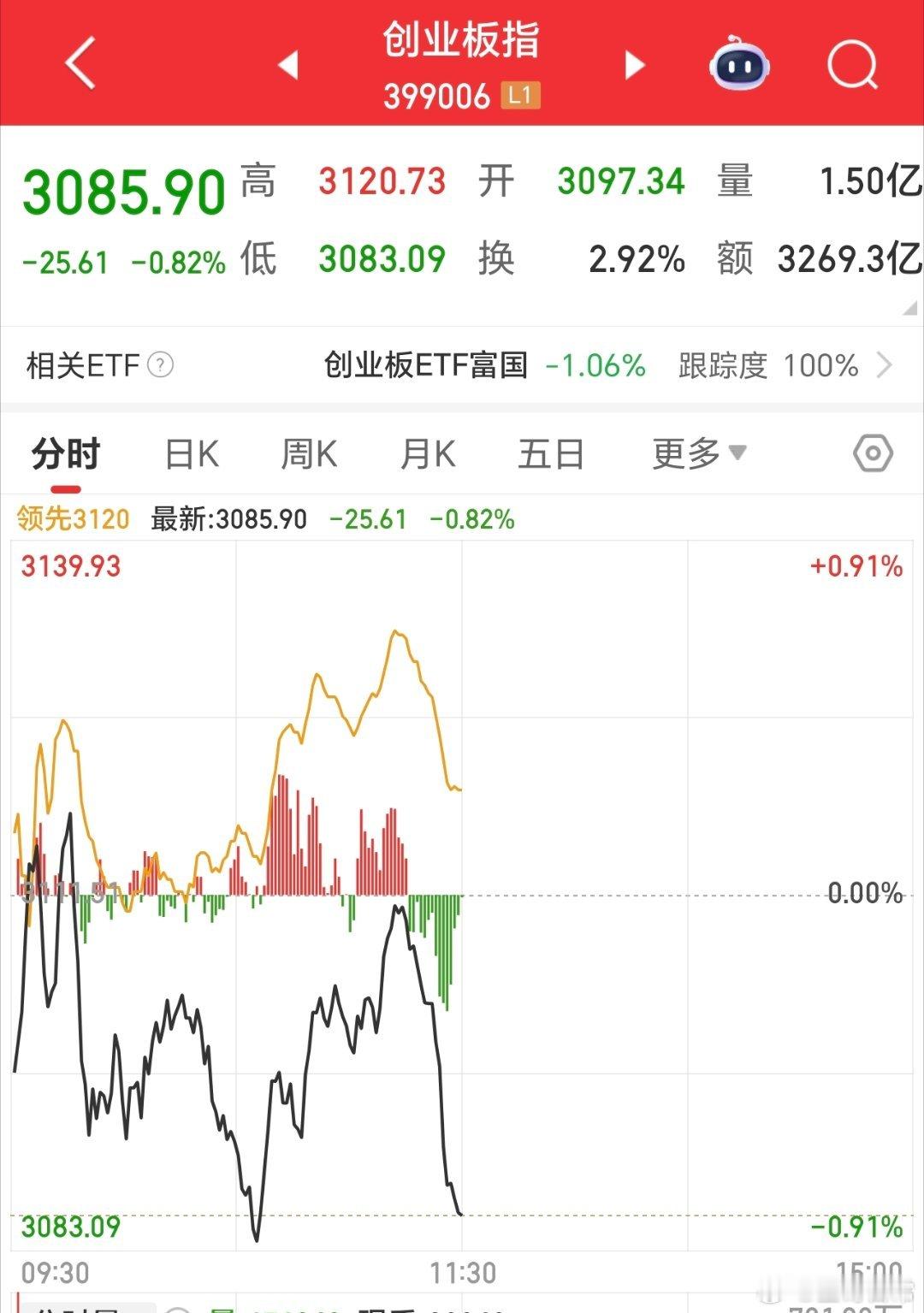 有点故意压盘的意思,创指差点翻红,结果又快速回落。非常有趣的现象。