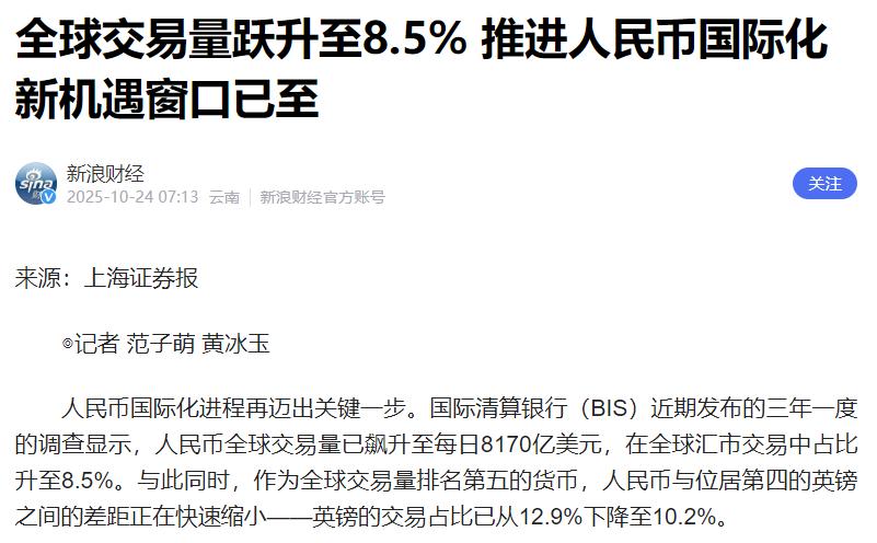 人民币,杀疯了?谁能想到,曾经在国际贸易中默默无闻的人民币,如今正以雷霆之势席卷全球金融版图! 在以前在国际贸易中,美元可是霸主,基本上所有的大宗商品、石油、天然气等能源,几乎都得用美元来结算,美国靠着这张“绿纸片”的特权,躺着就能收割全球财富。 结果随着美国国内经济的波动,美联储一会加息一会降息,搞得全球汇率跟着坐过山车,世界金融的重心开始发生微妙的变化,尤其是中俄等国对美元的依赖越来越不安,转而寻求一种更加“独立”的货币结算方式。 在这种背景下,人民币顺势而上,成为了国际贸易中的一个重要角色。 最直观的变化就体现在人民币跨境支付系统CIPS上,这个被称为“人民币版SWIFT”的系统去年处理的金额达到了175万亿元,同比增长43%,相当于每天都有近5000亿元的人民币在全球流动,而且已经覆盖了186个国家和地区。 这个系统2015年刚上线时还只是个“小透明”,现在已经成了人民币国际化的“主动脉”,不仅支持普通贸易结算,连债券通、跨境理财通这些高端金融业务都能搞定,甚至上海石油天然气交易中心的人民币计价LNG交易也得靠它来清算,美元霸权的墙角被悄悄挖动了。 能源领域历来是美元的“后花园”,但现在人民币也开始分到一杯羹。去年中俄石油贸易中,人民币结算比例直接冲到了42%,比2022年的15%翻了近三倍。俄罗斯可是全球主要的石油出口国之一,这意味着每卖出10桶石油就有4桶多是用人民币结算的。 更有意思的是沙特,这个曾经坚定的“石油美元”拥护者,2023年沙特阿美对华LNG贸易竟然有48%用人民币结算,这个比例刚好卡在美国财政部设定的“美元主导安全线”以下,既给足了美国面子,又实实在在地推进了人民币结算,这种“刀切豆腐两面光”的操作,把东方智慧玩得明明白白。 新兴市场更是成了人民币扩张的“主战场”。巴西央行的数据显示,今年4月人民币在巴西外汇储备中的占比已经达到15%,而2019年还只有1.1%,反观美元占比则从67%掉到了52%。巴西可是拉美第一大经济体,这种储备货币结构的变化可不是小打小闹。 而东盟作为中国第一大贸易伙伴,去年双方贸易总值6.99万亿元,也增长9%,虽然没有直接公布人民币结算比例,但从中国与共建“一带一路”国家贸易占比首次超过50%来看,人民币在区域贸易中的使用肯定少不了,毕竟谁也不想再被美元汇率波动坑钱。 当然现在人民币在全球外汇储备中的份额还是2.29%,跟美元的58%比起来还有差距,而且2023年还出现过短期下降,但拉长时间看,从2016年纳入IMF特别提款权以来,人民币储备规模已经增长了1.88倍,份额也翻了一番多。 这种波浪式前进的过程很正常,毕竟美元霸权经营了几十年,想一下子颠覆不现实。但现在越来越多的国家发现,手里多攥点人民币,就多一份金融安全的保障,就像家里备着不同牌子的感冒药,总比只靠一种强。 而人民币能这种稳步推进的势头,已经让全球金融格局变得越来越有意思了。