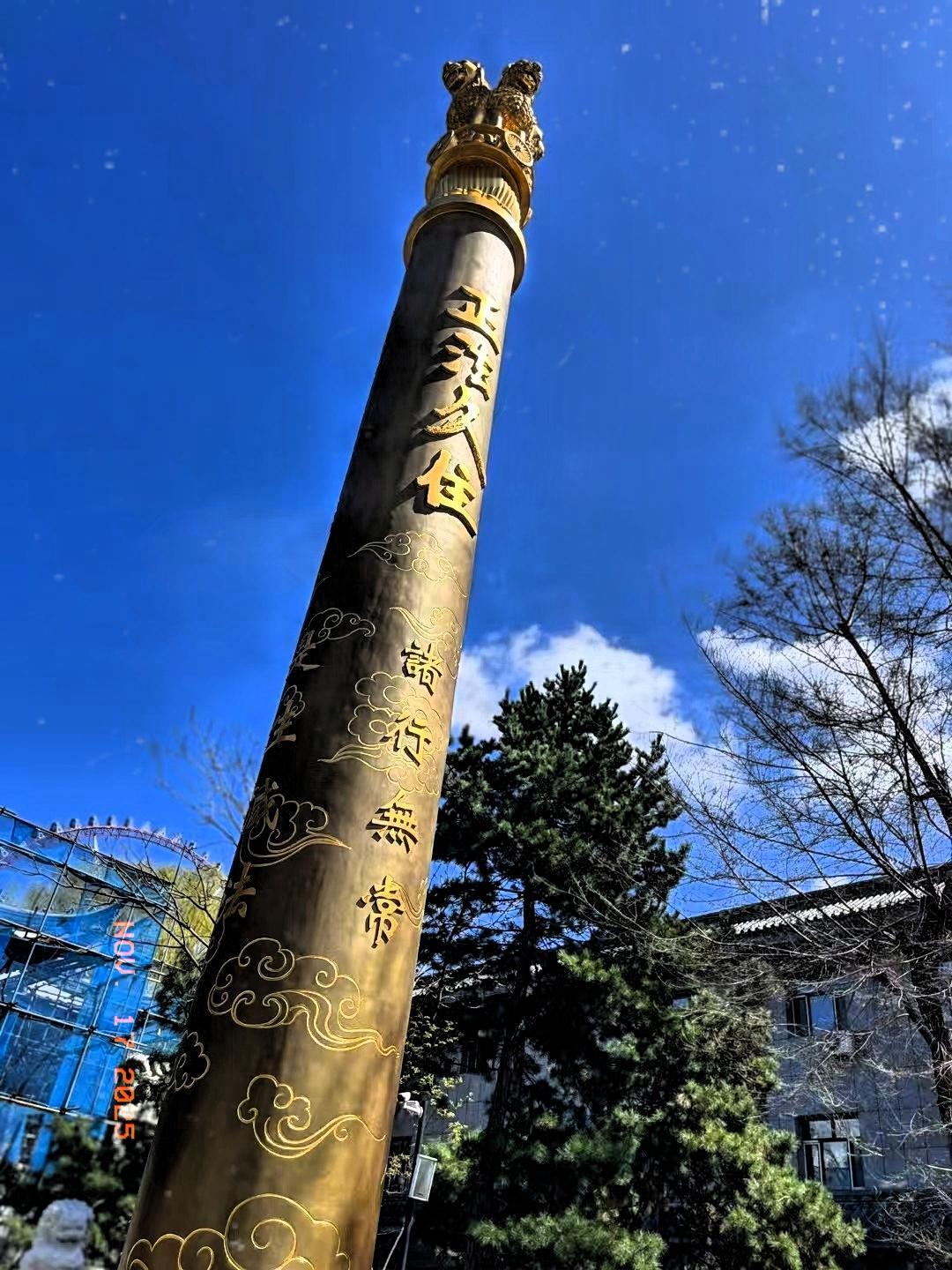 浮云过,天为幕,岁月在雕纹间流转! 晴空下金柱立着,“正心正念”四个字裹在云纹里。风过处,天朗树静,像把纷扰都滤成了轻烟——日子里的纷扰,会被这稳稳的字意滤成轻烟。站在这儿抬眼,天朗心也静,忽然懂了:心安处,处处是禅房。 一念静 万境清