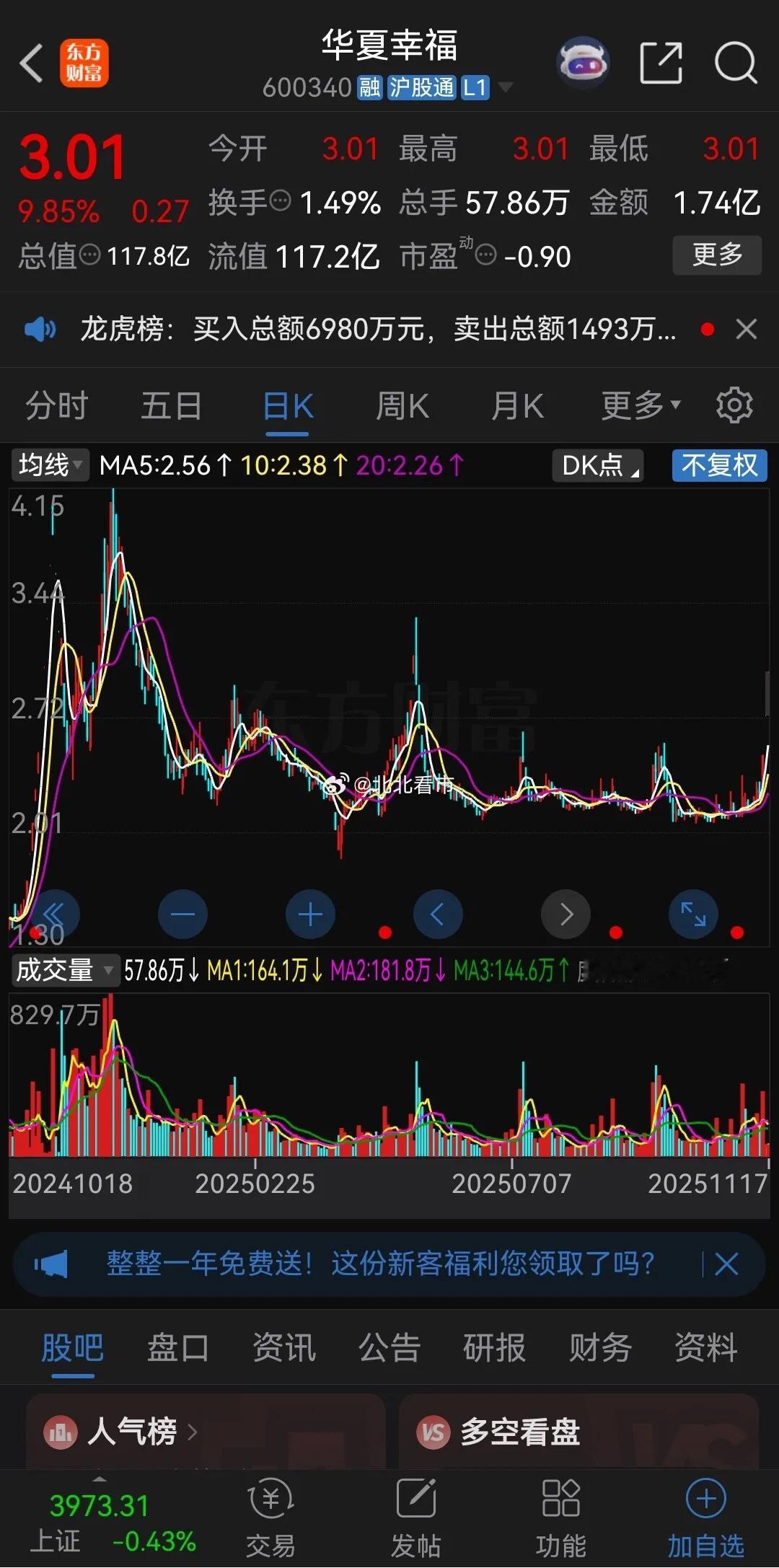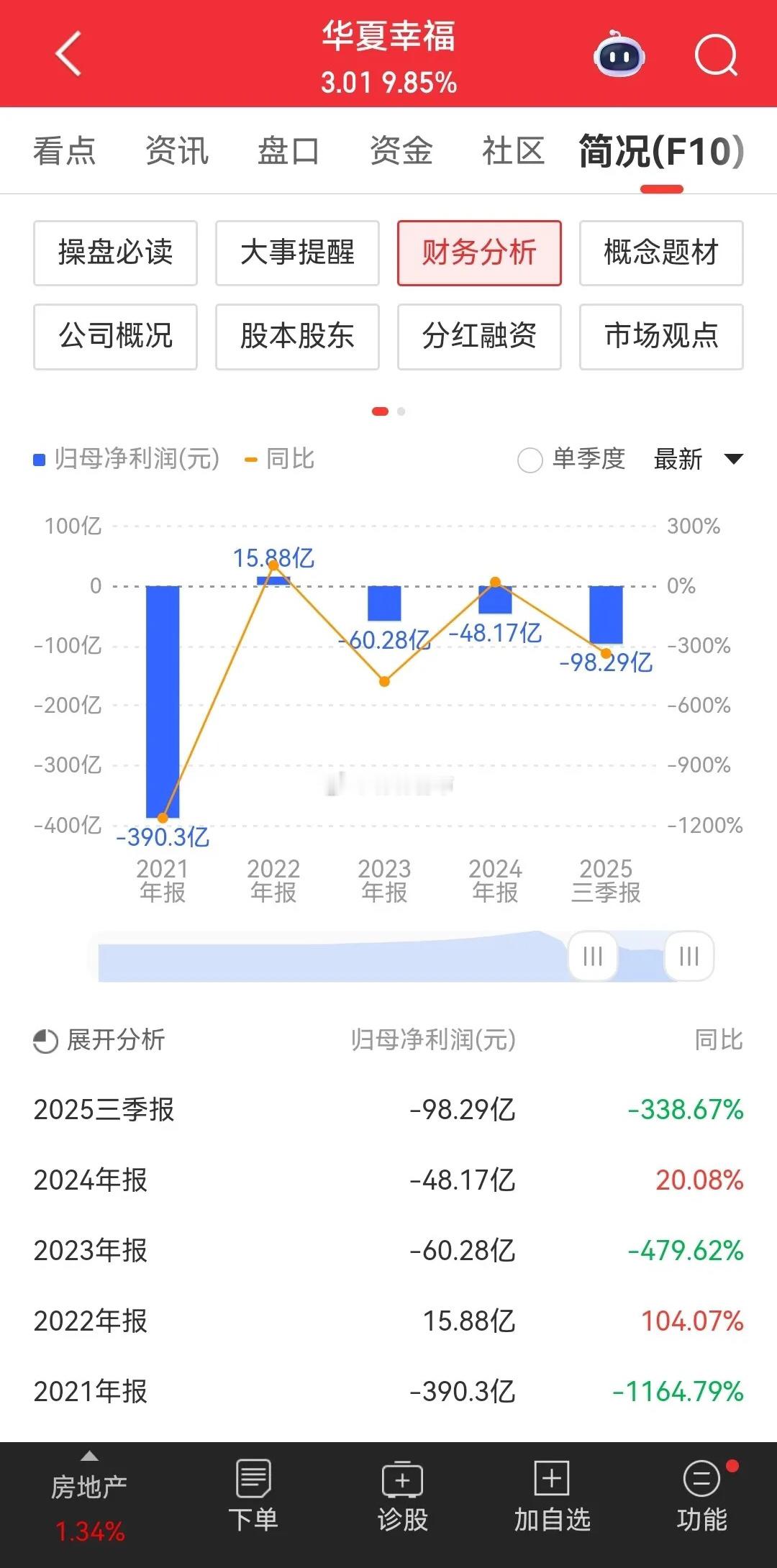 炒股炒成了玄学!华夏幸福业绩连年大亏,2021年时曾经巨亏390.3亿元,2023年亏损60.28亿元,去年亏损48.17亿,而今年三季报又亏了近百亿元。每股收益-2.511元,每股净资产-1.210元,亏得是惨不忍睹。但这丝毫不影响它的精彩表演。去年十月份因为化债概念,就已经暴涨了一波,当时从一块多钱涨到了4块多,上涨了三倍多。时隔一年又卷土重来,这次因为名字比较吉祥,寓意好,又开始被爆炒,目前已经三个涨停了,首板涨停后,连续两个一字板,截至今天上午收盘股价报收于3.01元,涨停板上有封单高达209万手,涨停板被牢牢封死,散户已经没有上车机会了。炒股炒成了玄学,业绩好不好无所谓,有个好名字就行,股市就是这么神奇!