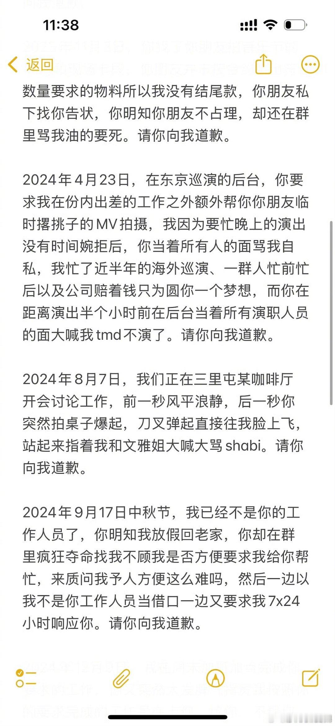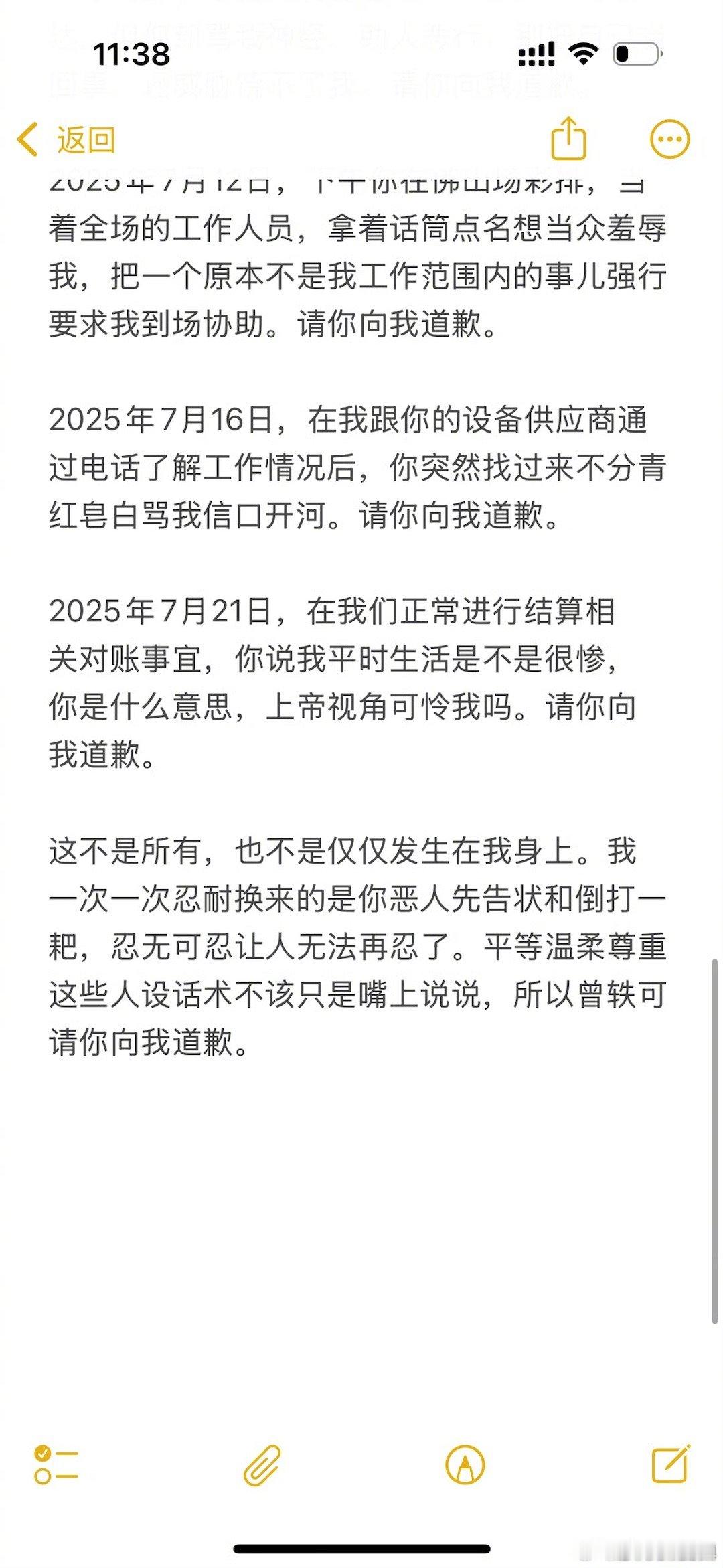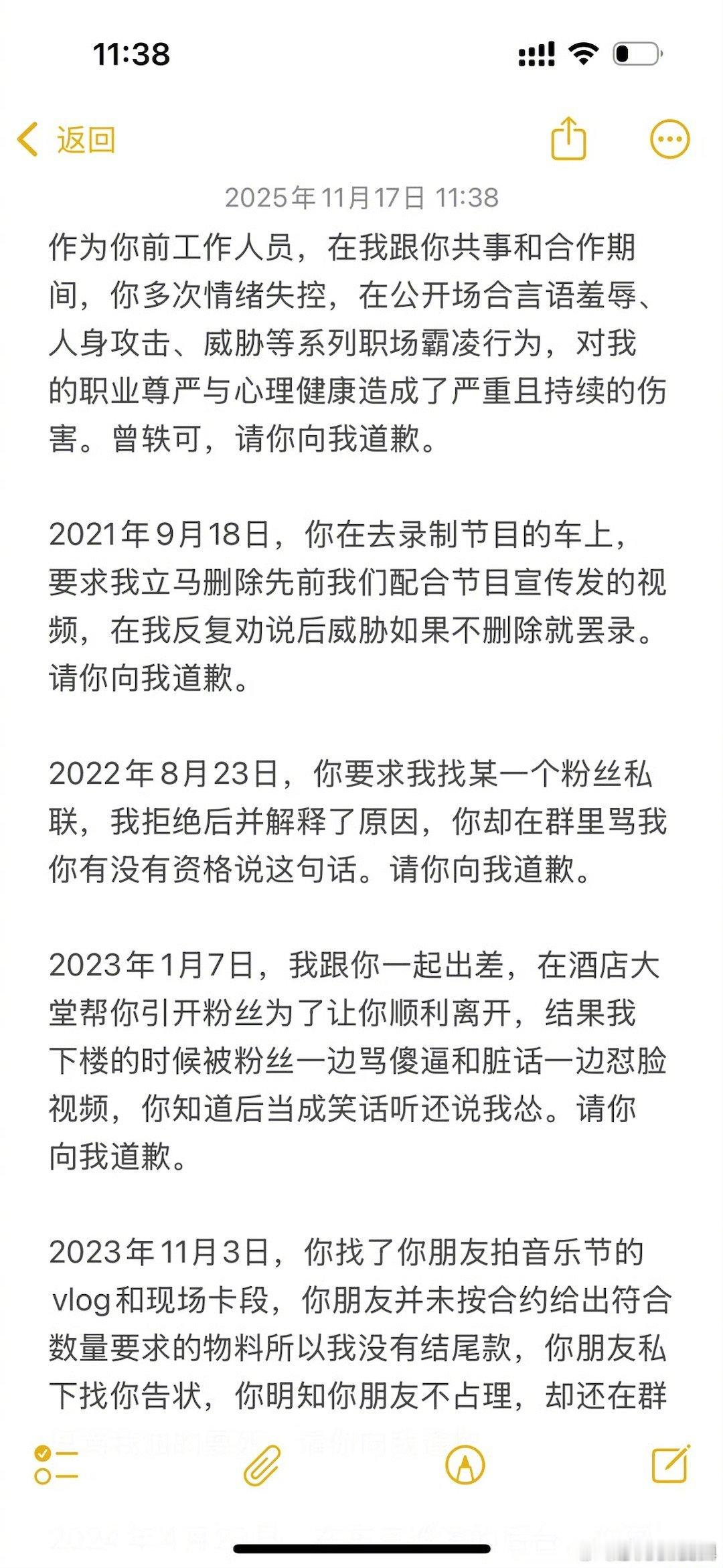 表示共事期间曾轶可在公开场合言语羞辱人身攻击自己,要求曾轶可道歉~