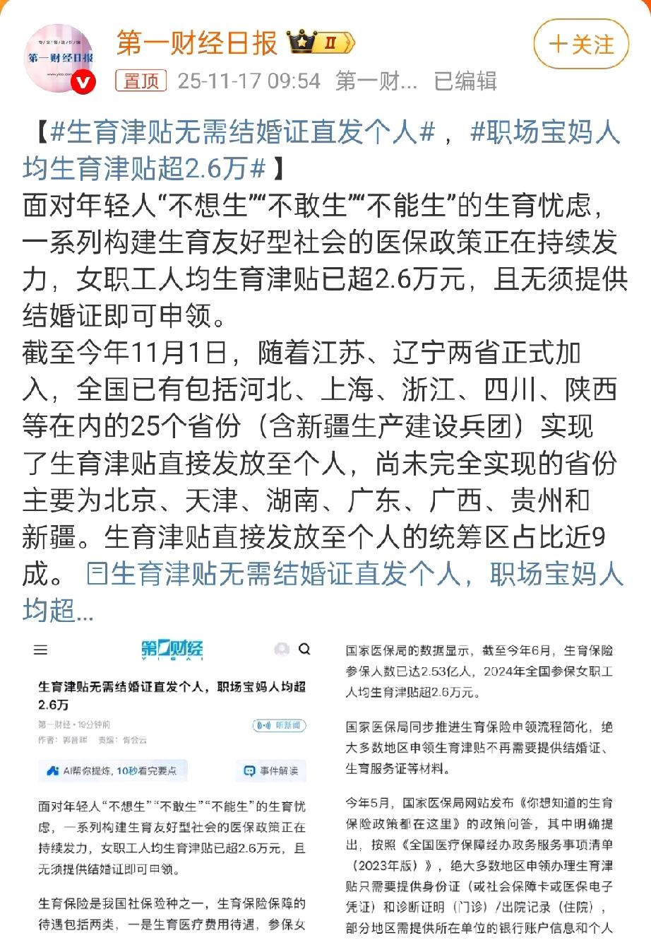 生育津贴无需结婚证直发个人。很好,鼓励生育就得直接,让乐意生育的人生育。为什么