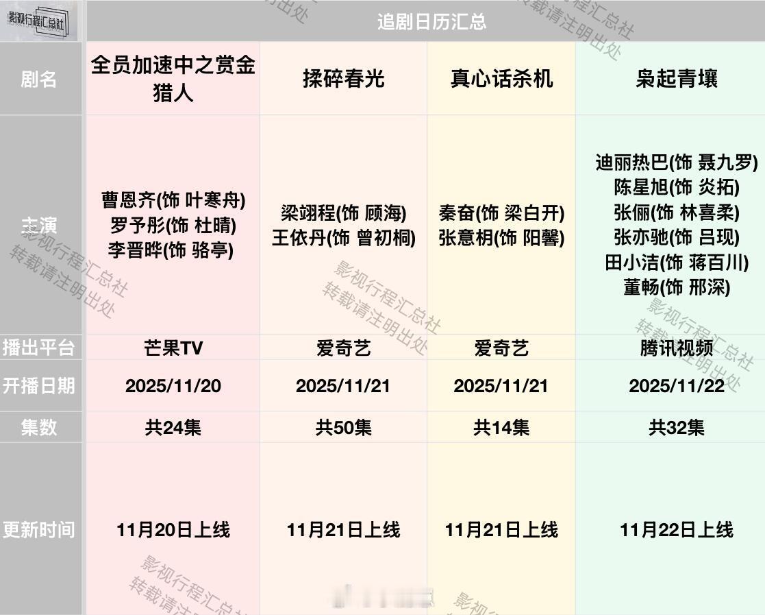 迪丽热巴陈星旭《枭起青壤》定档11月22日影视行程汇总社 电视剧追剧日历更新:11.17-22日开播剧《逆时而来的你》许卓伦(饰 余星辰) 徐媛媛(饰 苏若) 腾讯视频2025/11/17《龙王令之妃卿莫属》李沐宸(饰 凤芷楼) 叶盛佳(饰 楚墨殇) 管栎(饰 涅容止)腾讯视频 2025/11/18《她的池中之物》王奕然(饰 林屿白/钟枭) 贾翼瑄(饰 钟妄笙) 爱奇艺 2025/11/18《恶魔之吻》吴季峰(饰 夜煊) 王艺阳(饰 姜灼) 爱奇艺 2025/11/19《二龙湖浩哥之天下无赖》张浩(饰 张天霸) 梅宝莱(饰 小薇) 张涛(饰 涛子) 爱奇艺 2025/11/20《全员加速中之赏金猎人》曹恩齐(饰 叶寒舟) 罗予彤(饰 杜晴) 李晋晔(饰 骆亭) 芒果TV 2025/11/20《揉碎春光》梁翊程(饰 顾海) 王依丹(饰 曾初桐) 爱奇艺 2025/11/21《真心话杀机》秦奋(饰 梁白开) 张意枂(饰 阳馨) 爱奇艺 2025/11/21《枭起青壤》迪丽热巴(饰 聂九罗) 陈星旭(饰 炎拓) 张俪(饰 林喜柔) 张亦驰(饰 吕现)田小洁(饰 蒋百川) 董畅(饰 邢深) 腾讯视频 2025/11/22