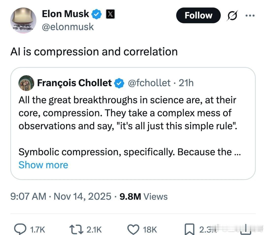 AI的本质竟然是压缩马斯克转发的这条推文把AI讲透了。所有科学突破的核心都是压缩