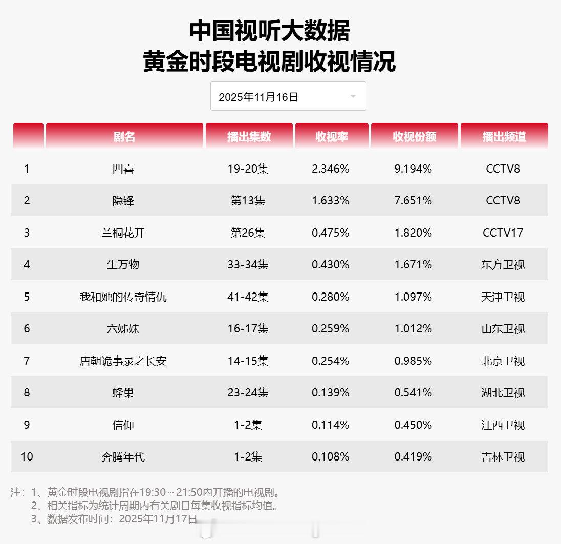 【2025年11月16日中国视听大数据CVB黄金档电视剧收视率日榜TOP10】1 四喜 CCTV82 隐锋 CCTV83 兰桐花开 CCTV174 生万物 东方卫视5 我和她的传奇情仇 天津卫视6 六姊妹 山东卫视7 唐朝诡事录之长安 北京卫视8 蜂巢 湖北卫视9 信仰 江西卫视10 奔腾年代 吉林卫视