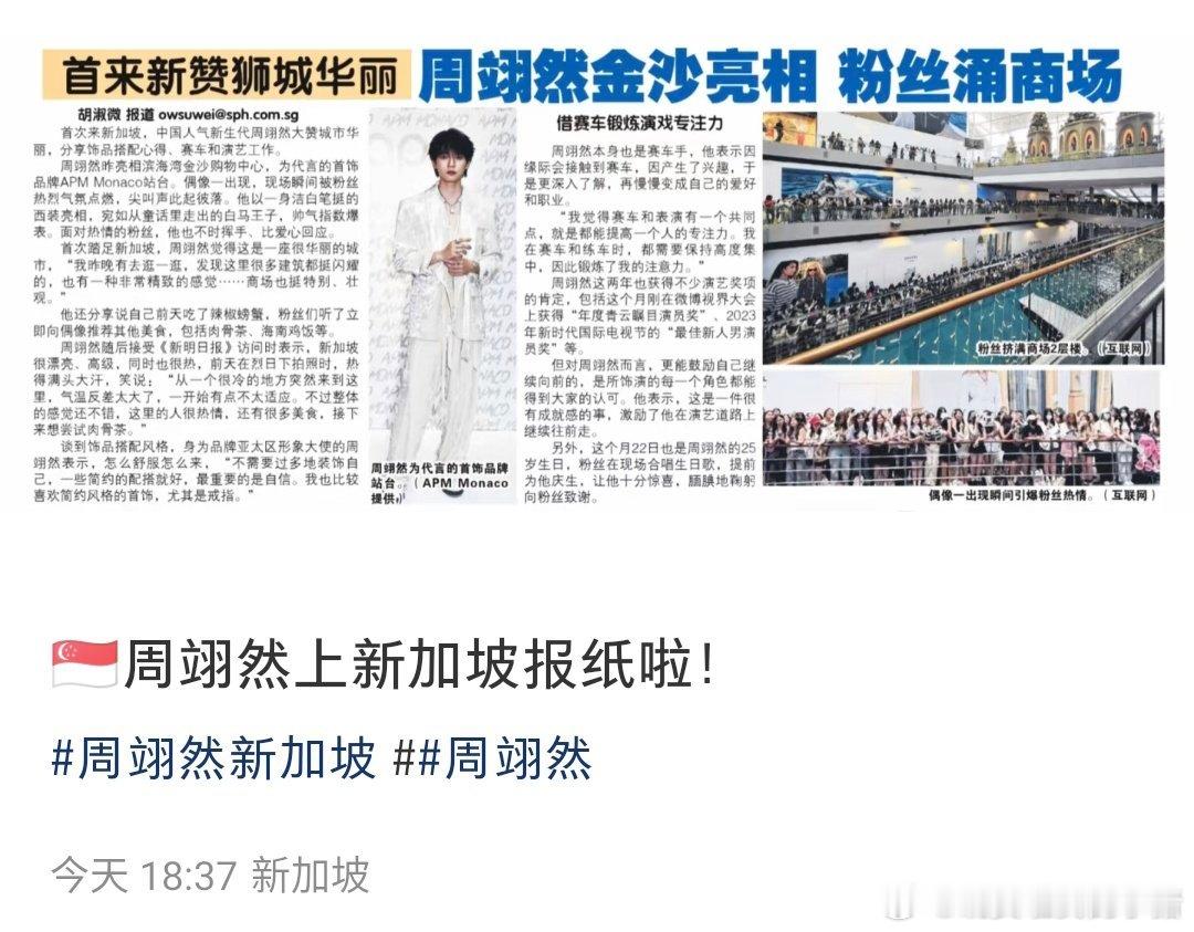 周翊然登上新加坡报纸,标题盛赞:首来新赞狮城华丽,周翊然金沙亮相 粉丝涌商场,正文提到了他爱的粉丝和赛车🥰🥰