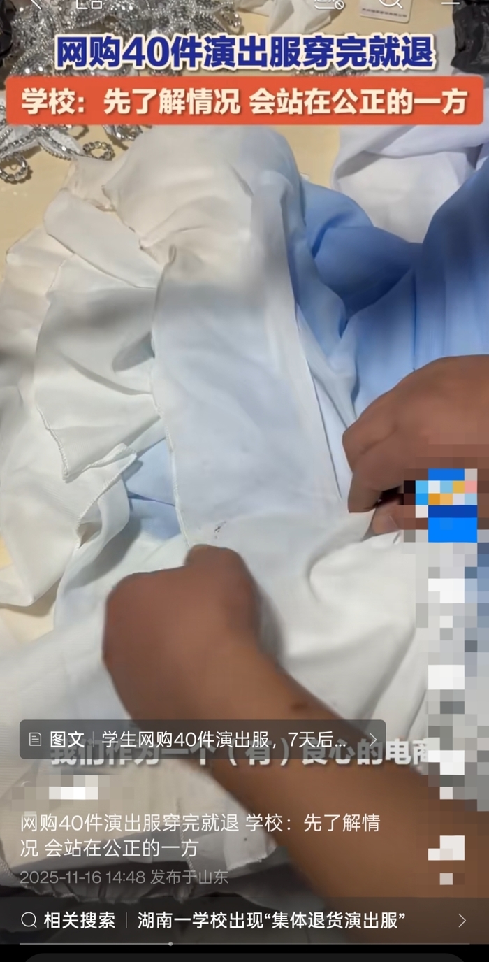日前,湖南常德汉寿县有学生被曝网购40件演出服,演出结束后申请退货退款,由商家承担无法二次销售的损失。11月17日,汉寿县委宣传部回应新黄河记者称,当地教育部门已介入调查。有律师分析称,如果校方知情默许,需和学生一起承担连带赔偿责任。