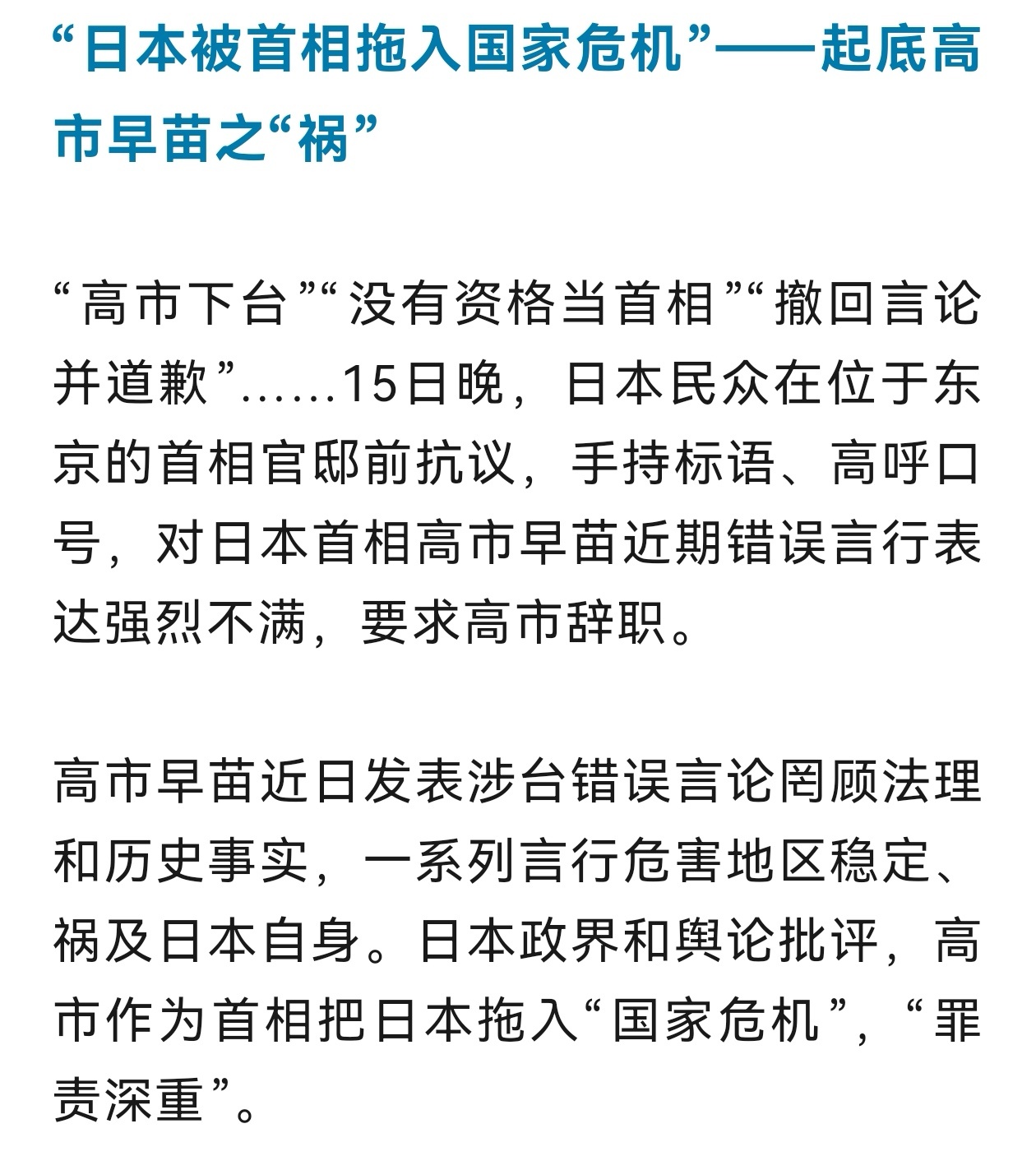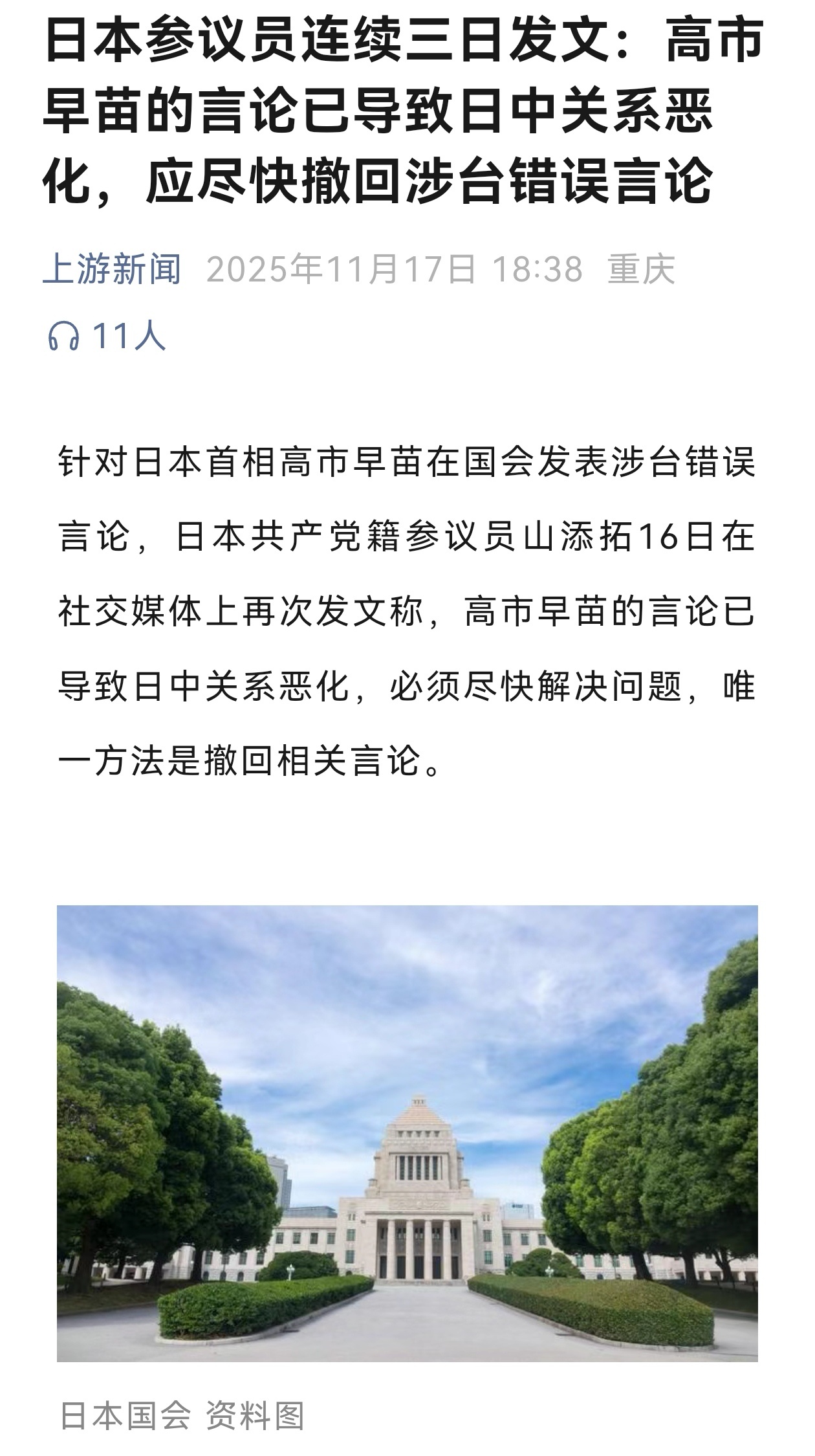 11月7日,日本首相高市早苗在国会答辩中暗示,若中国大陆对台动武,日本可能将其视为“存亡危机事态”,不排除行使集体自卫权、武力介入台海。高市早苗涉台挑衅言论,引发国际震动,中方强烈抵制回应,日本旅游股、零售股、航空股随后大跌,使得日本外务省官员紧急访华。据日媒报道,党内已提醒高市“对台湾问题的认知明显不足”,今后将严控类似发言,避免进一步刺激中方。在我看来,这是日本惯用的“降温”操作,高市早苗作为极右翼分子,不仅多次参拜靖国神社,更曾建议以“安倍谈话”代替“村山谈话”,极力淡化日本在二战中的侵略罪行,很难经过几天就能彻底“反省”。长久以来,日本政坛极右分子总是暗戳戳地“反华”,又不敢彻底与中国撕破脸皮,持续充当着美国的马前卒,通过挑衅中国低调,来试探美国的态度,进而获得美国的各种支持,这一次也不例外。