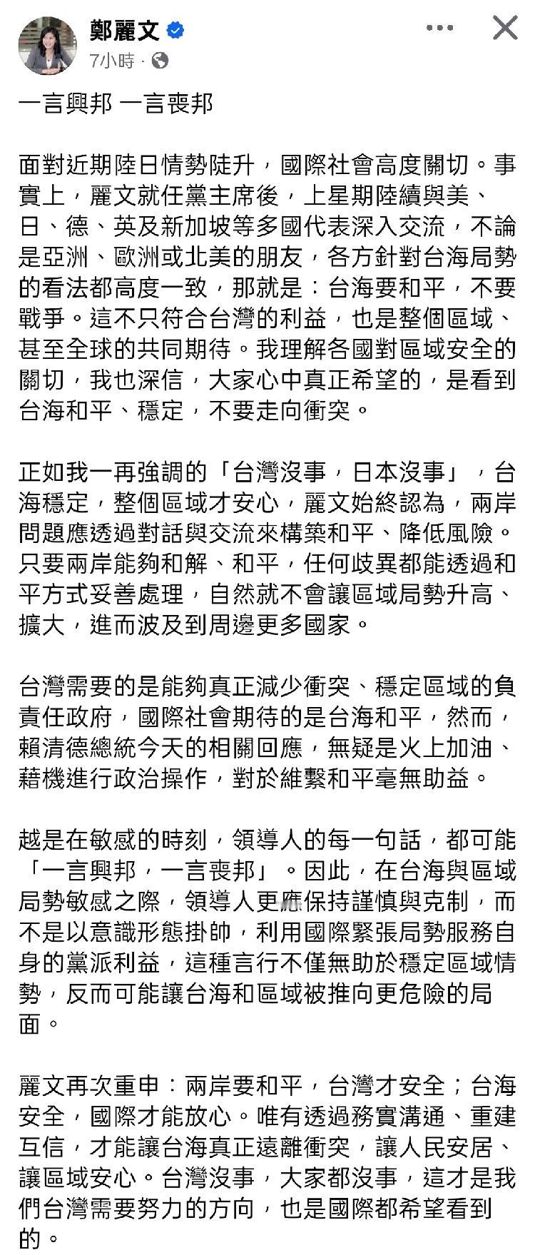 “一言兴邦,一言喪邦” 郑丽文还是太客气了,应该直接对高市早苗呛一声,干你屁事。 对于赖清德,网友也习惯了这个人,还挺乐见他加速两岸统一的进程。