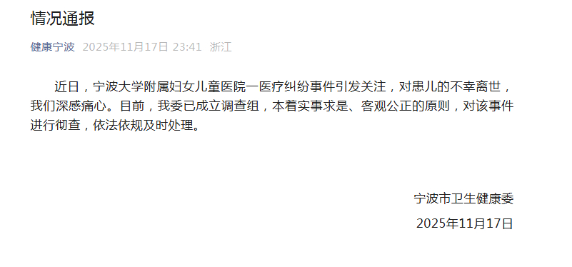 11月17日,宁波市卫生健康委通报:近日,宁波大学附属妇女儿童医院一医疗纠纷事件引发关注,对患儿的不幸离世,我们深感痛心。目前,我委已成立调查组,本着实事求是、客观公正的原则,对该事件进行彻查,依法依规及时处理。