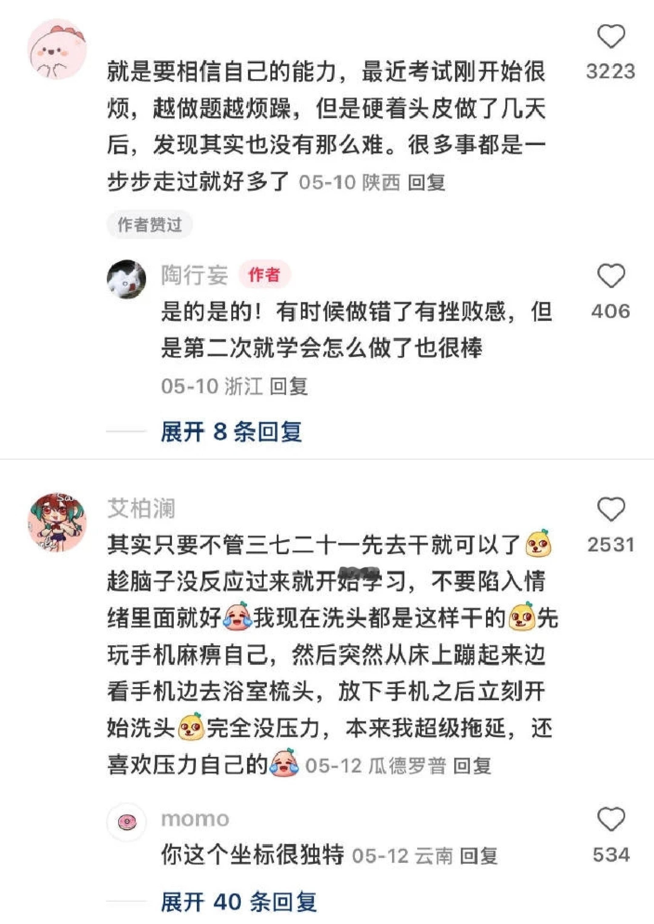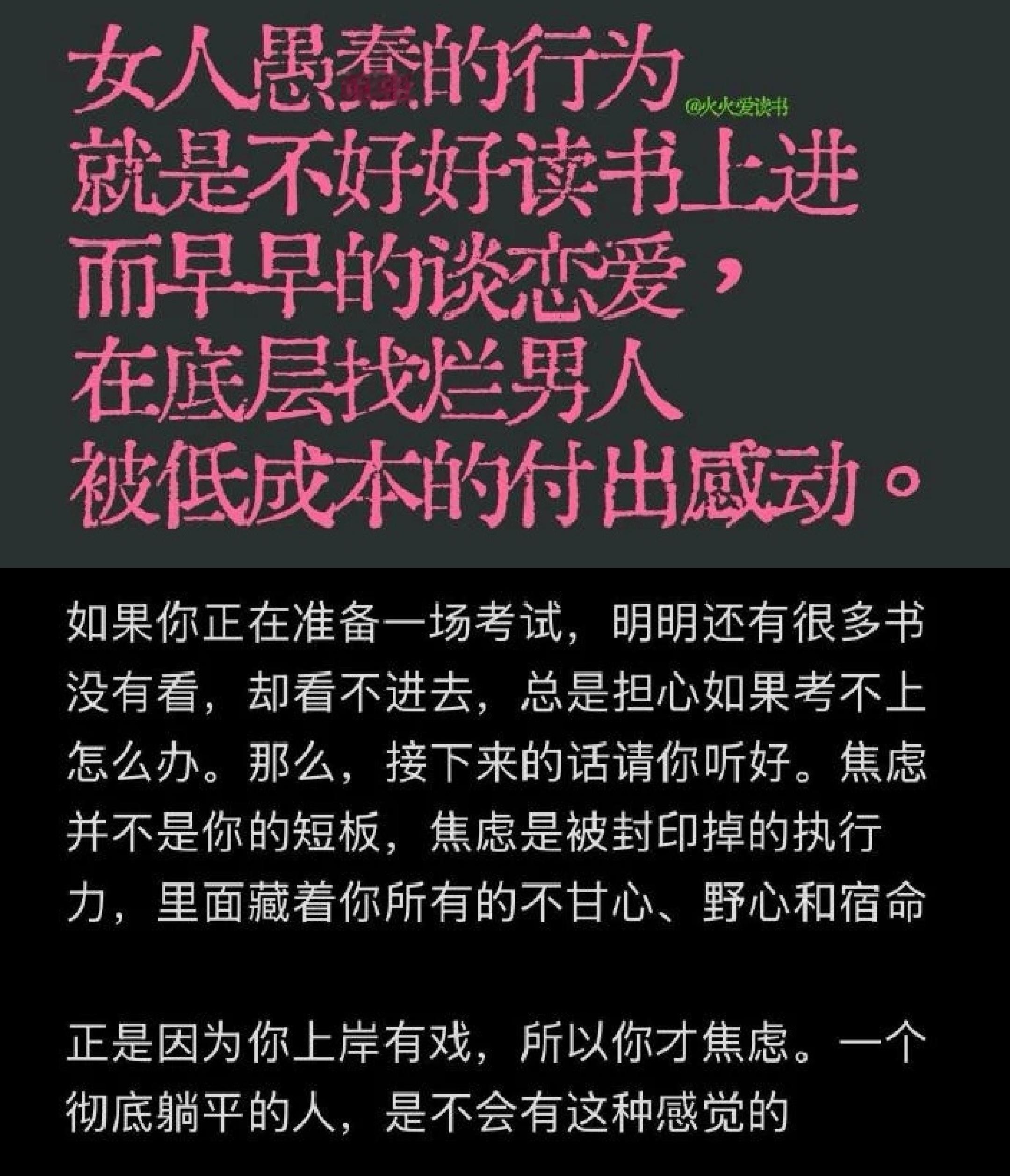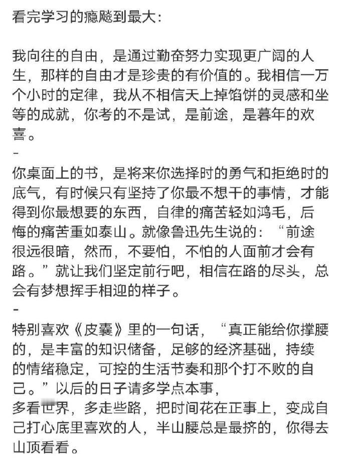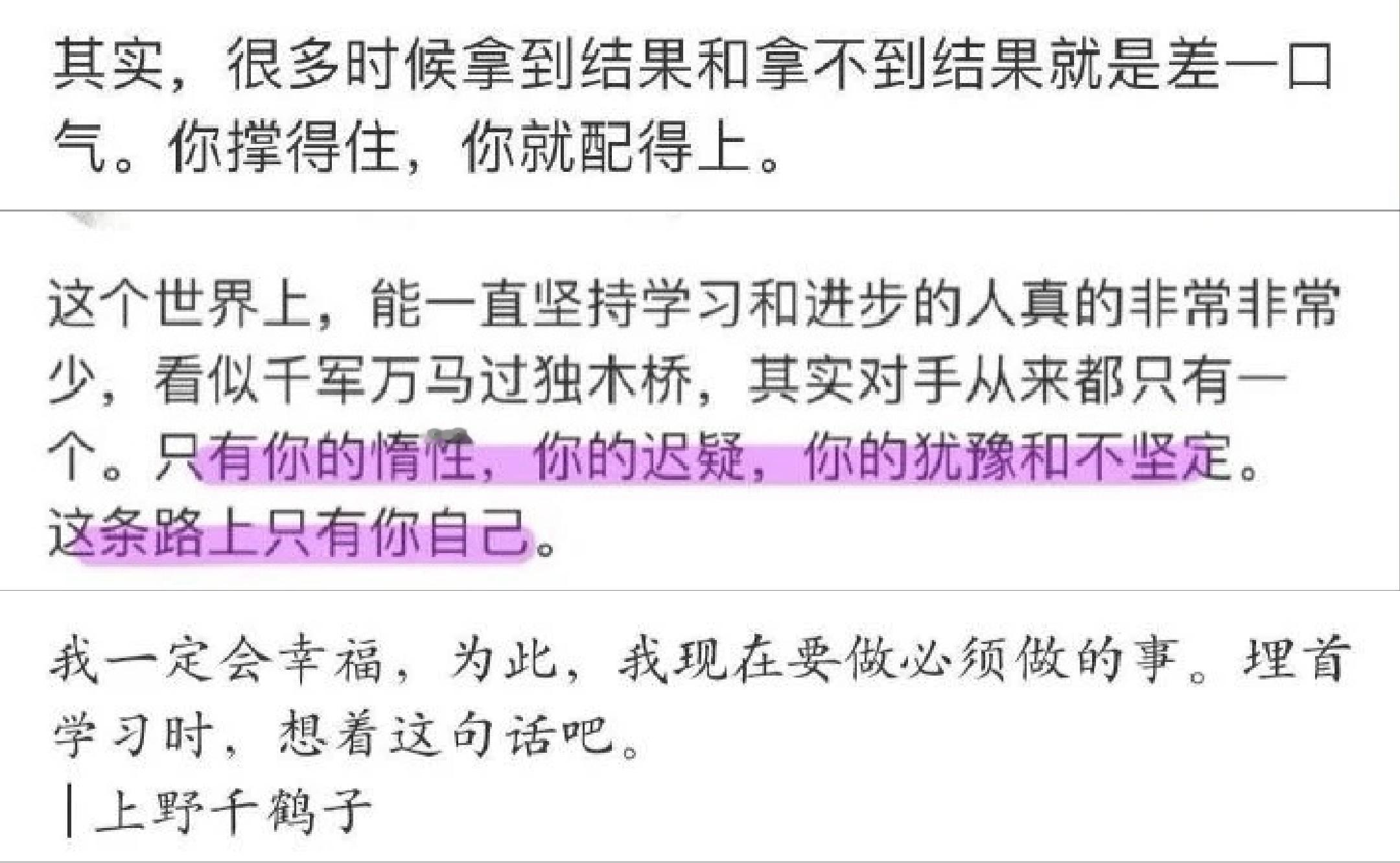学不进去的时候,就反复读读心灵鸡汤。一颗向上的心脏,不应该有一副下坠而懒惰的身体。人可以苦一阵子,但不能苦一辈子,何时葡萄先熟透,你要静候再静候。看似千军万马过独木桥,其实对手从来都只有一个,只有你的惰性,你的迟疑,你的犹豫和不坚定,这条路上只有你自己。永远不要否定自己的进步,走的再慢,也好过永远原地踏步。焦虑并不是你的短板,焦虑是被封印掉的执行力,里面藏着你所有的不甘心、野心和宿命,一个彻底躺平的人,是不会有这种感觉的。真正能给你撑腰的,是丰富的知识储备,足够的经济基础,持续的情绪稳定,可控的生活节奏和那个打不败的自己。