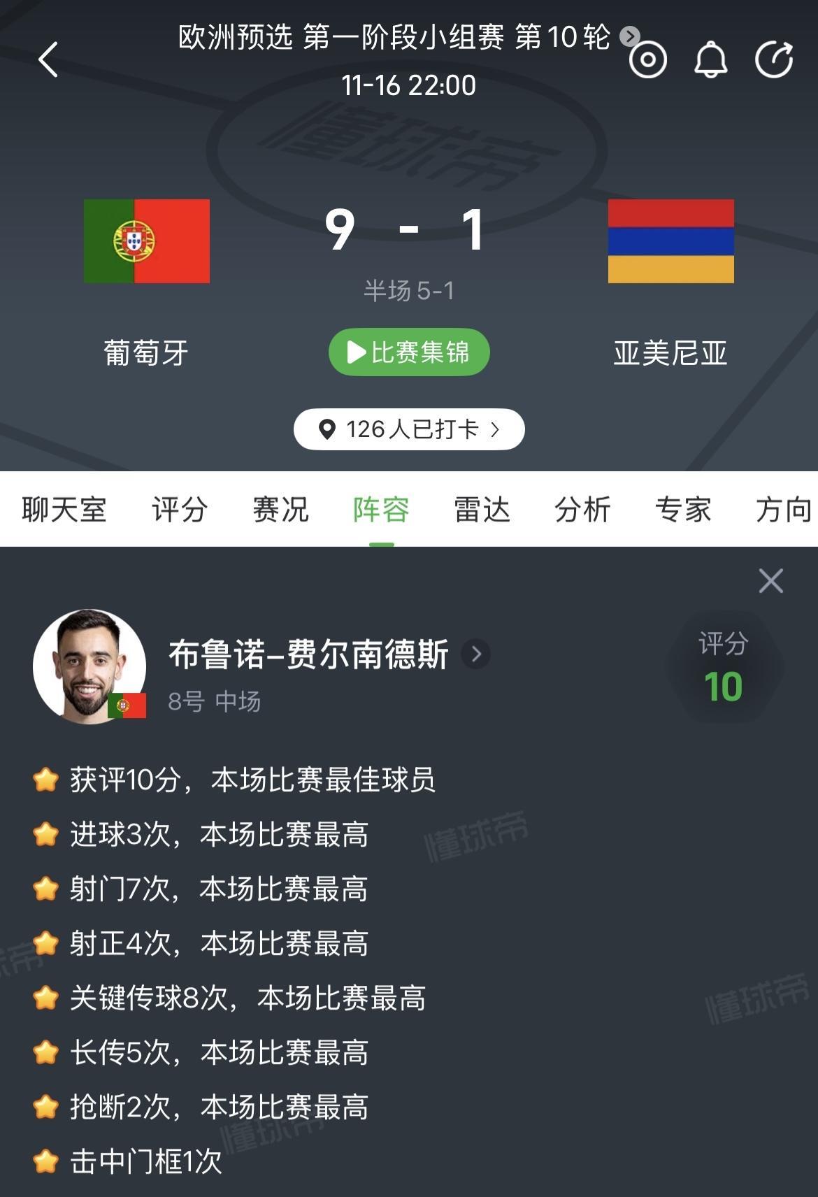 葡萄牙9:0亚美尼亚,B费数据如下: 进球3次,全场最高 关键传球8次,全场最高 抢断2次,全场最高 获评10分,全场最高 丢失球权16次,全场最高 对此,C罗粉丝表示:B费带球丢球率是最高的,球到手后非要盘,即使带不动也要盘几下,场均丢球二十次左右。如果没有资本,他也就是一个二流球星。
