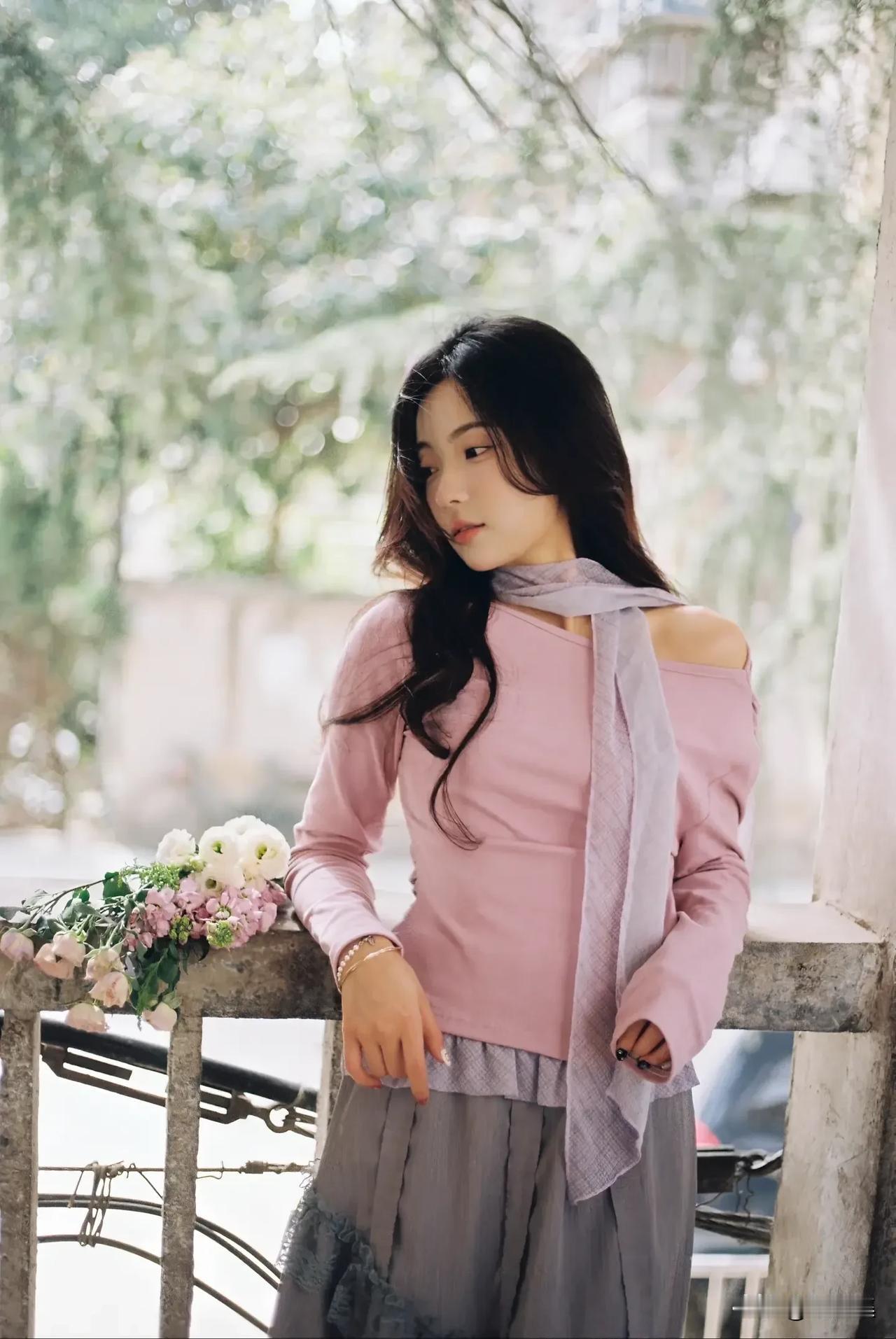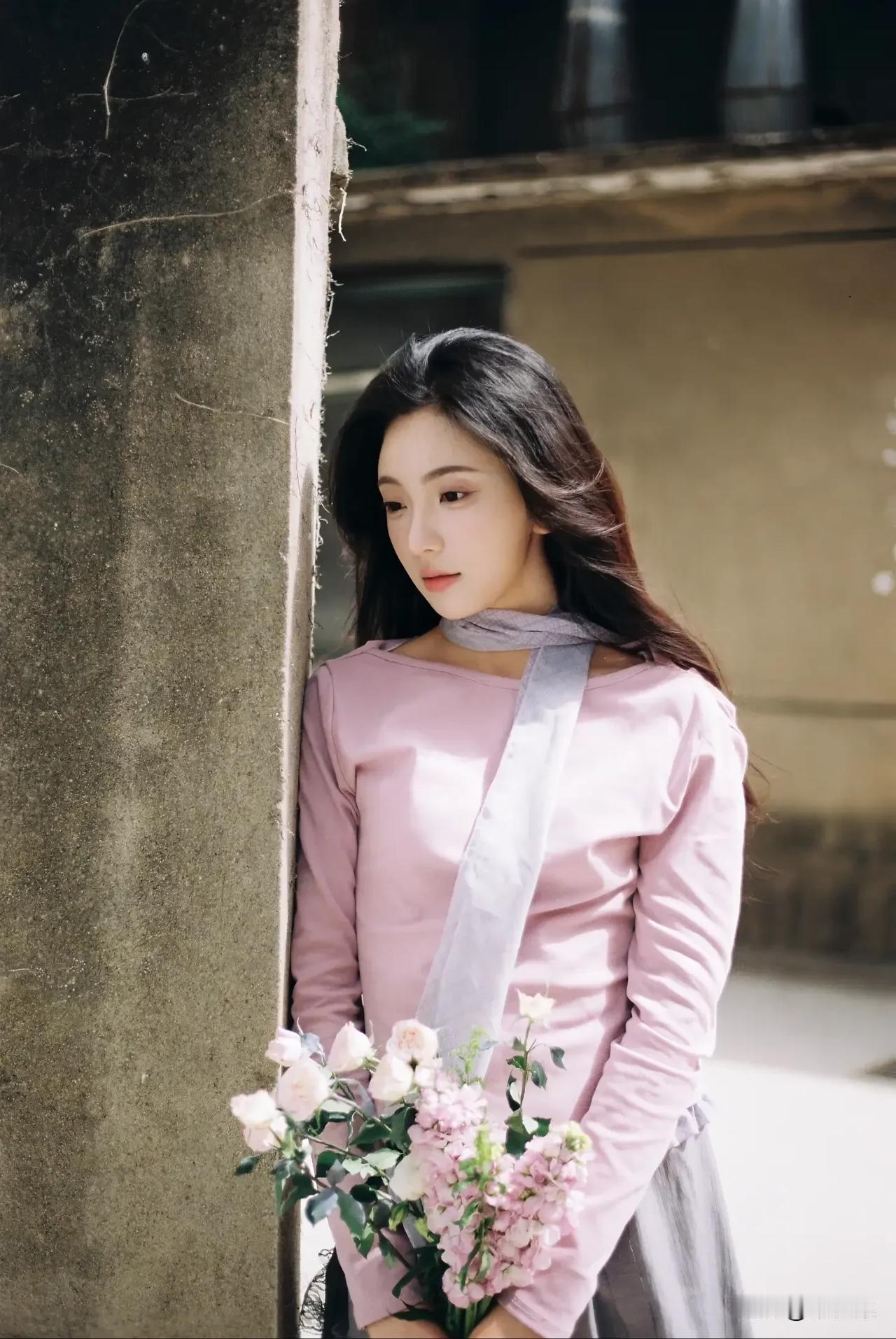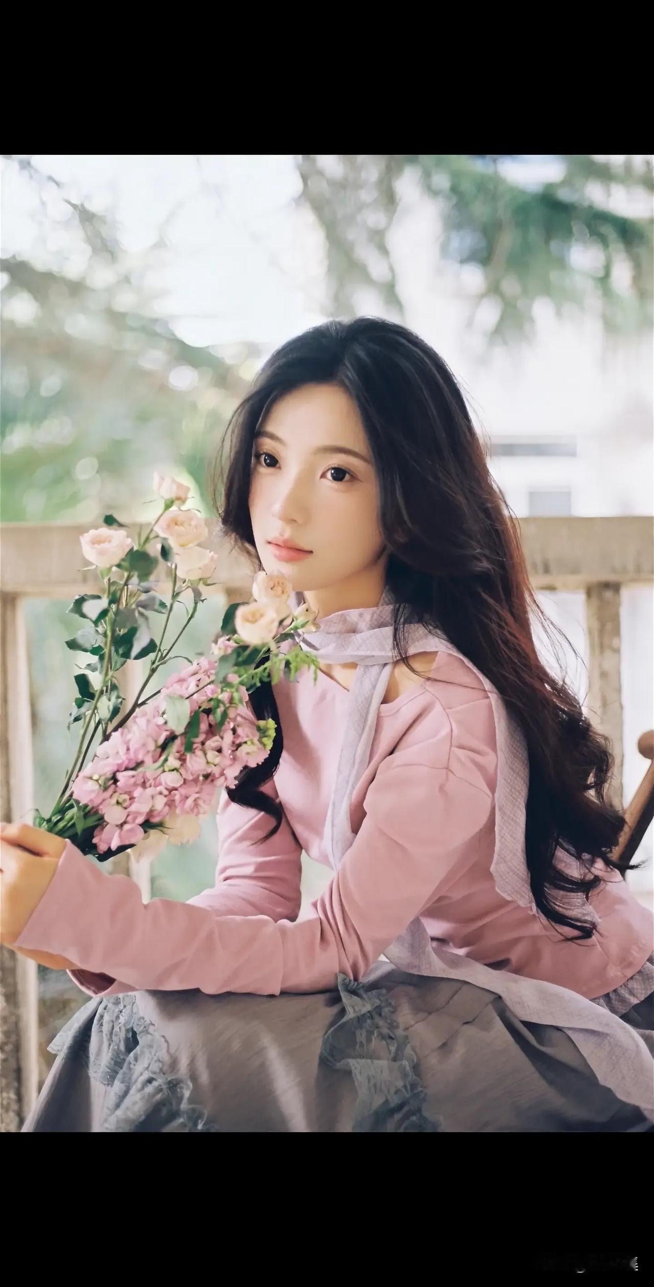 黑发红唇,优雅沉静,粉花点缀,气质如兰。