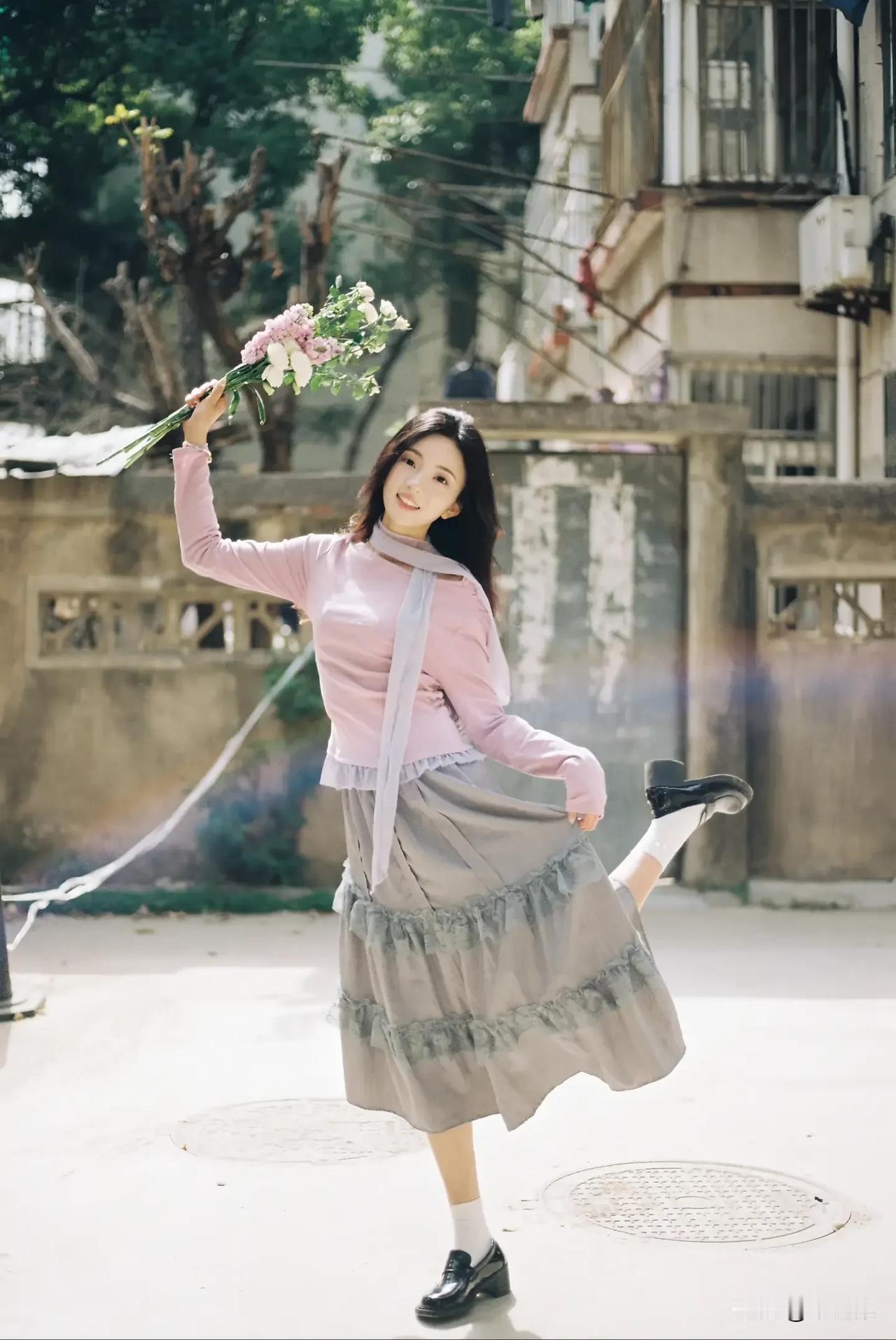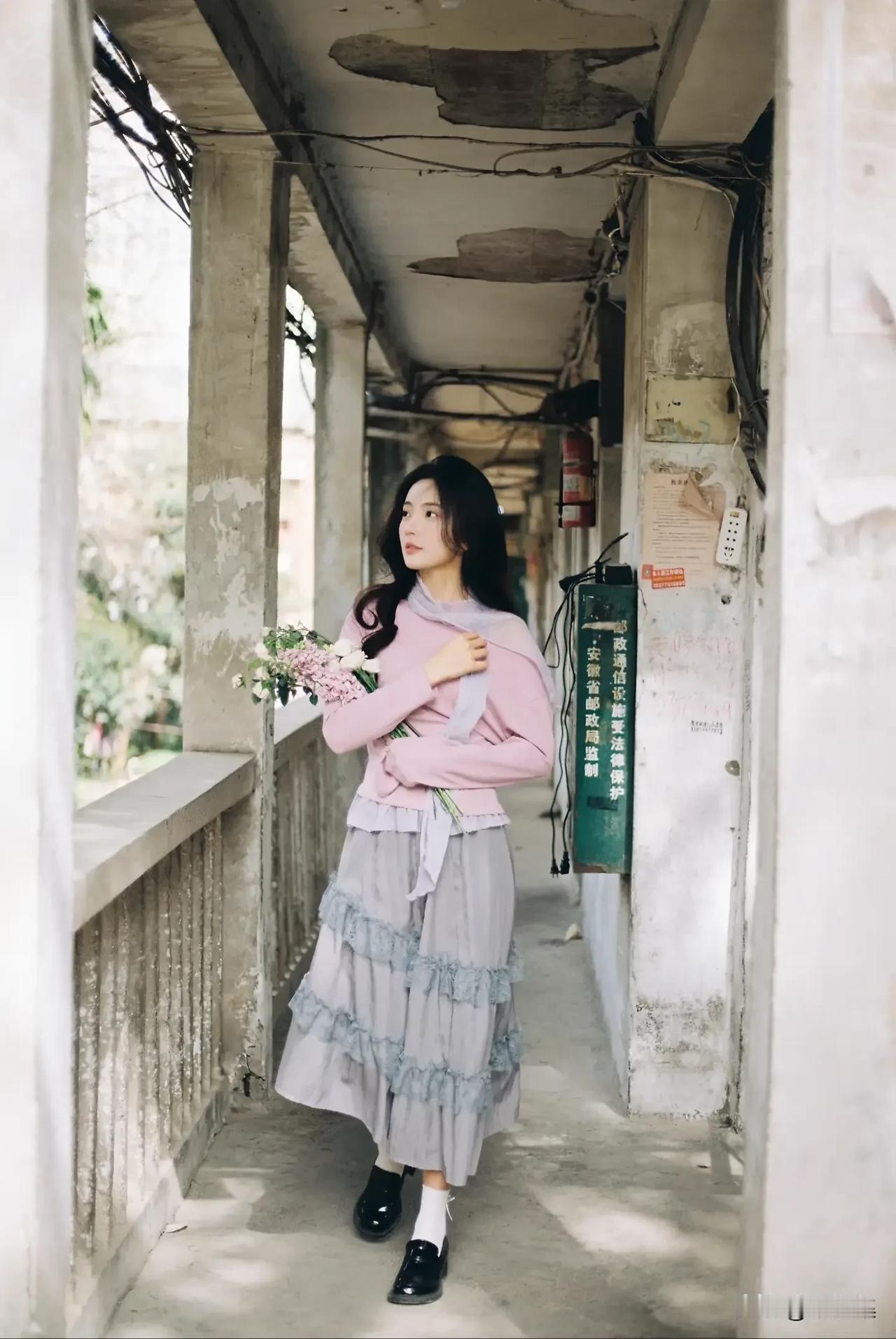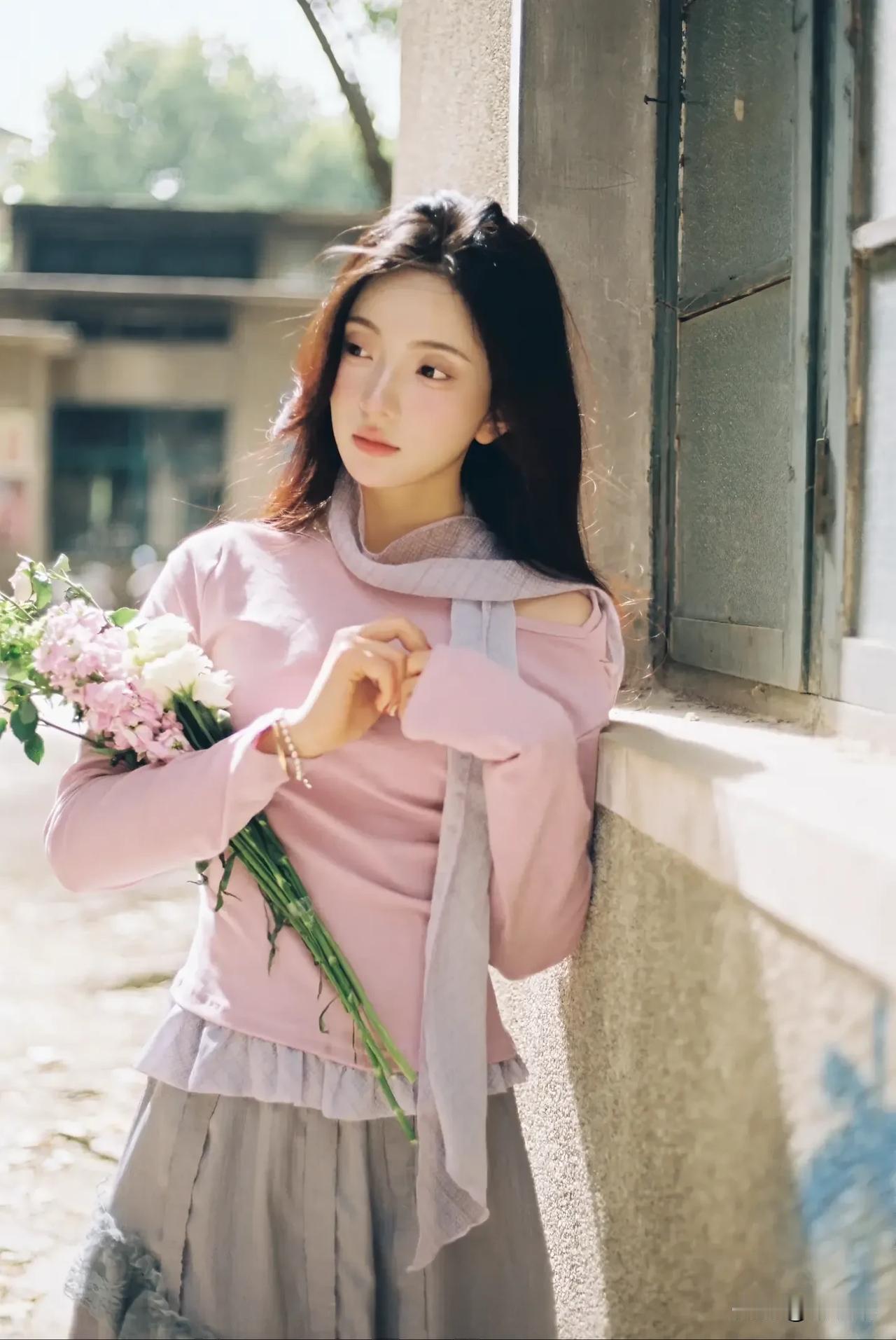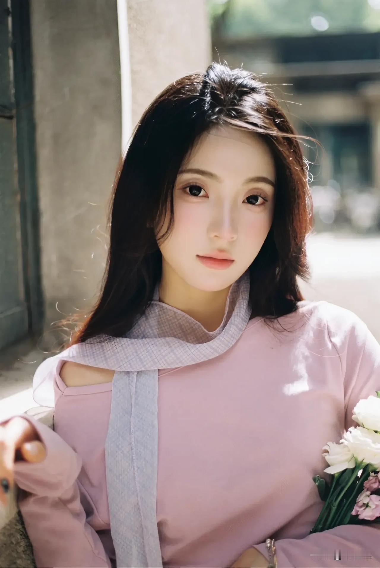 黑发红唇,优雅沉静,粉花点缀,气质如兰。