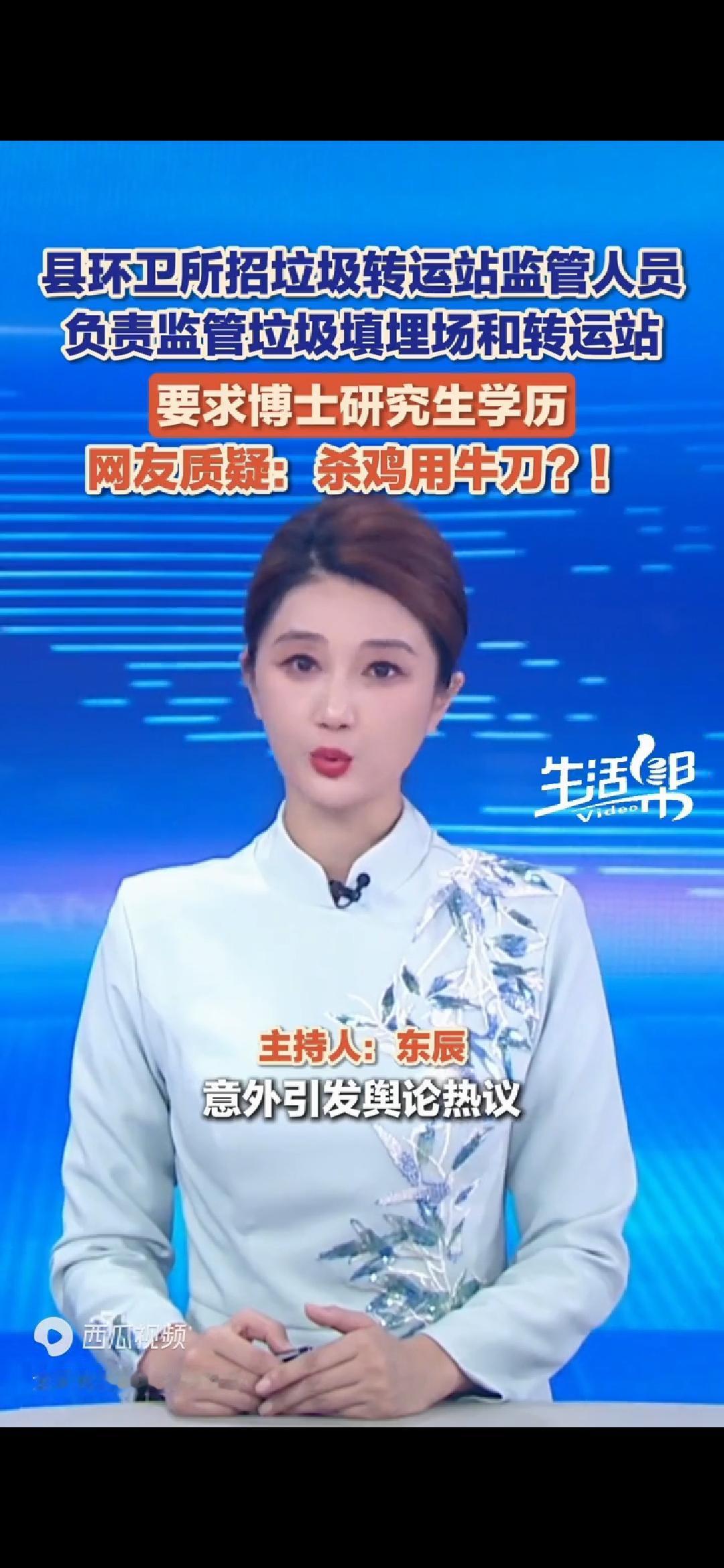 广东一县环卫所只招博士引质疑!一个仅9人编制的基层单位,管垃圾场要求博士学历? 垃圾填埋和转运,而且只是9个人的编制,需要博士,这简直就是牛刀杀小鸡。 我想问这么多年的垃圾转运和填埋都是博士生吗?,如果不是运作还正常吗?,如果正常为什么要博士?这要求是否合理? 就这件事,至少可以有两个说法,一种说法是:浪费人才,读书无用。另一种说法就是:工作无贵贱,孔乙己要学会脱下长衫。是金子总会发光的。
