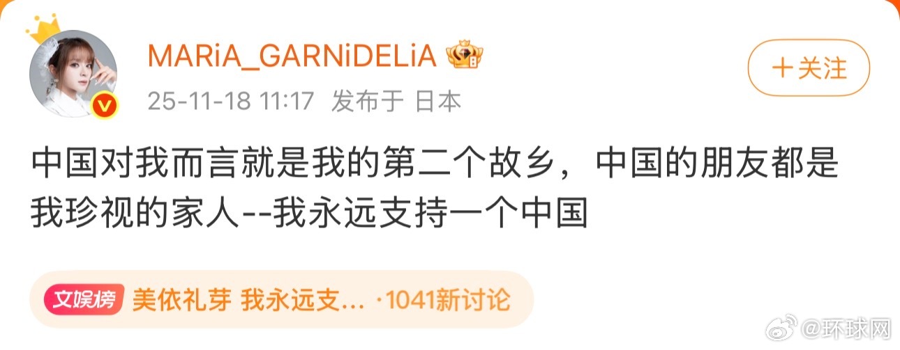 11月18日,日本歌手美依礼芽 发布微博称:中国对我而言就是我的第二个故乡,中国的朋友都是我珍视的家人——我永远支持一个中国。 美依礼芽,本名水桥舞,日本女歌手、NICONICO动画舞见、二次元音乐组合GARNiDELiA成员。2016年,她便凭借神曲《极乐净土》走红网络。