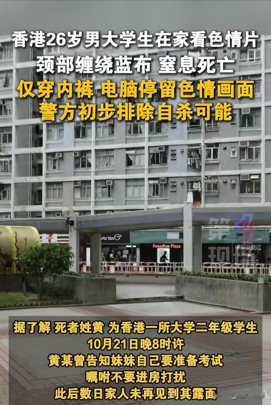 香港26岁男大学生在家看有色电影时离奇死亡。 原因为颈部缠绕布条,窒息昏迷,因