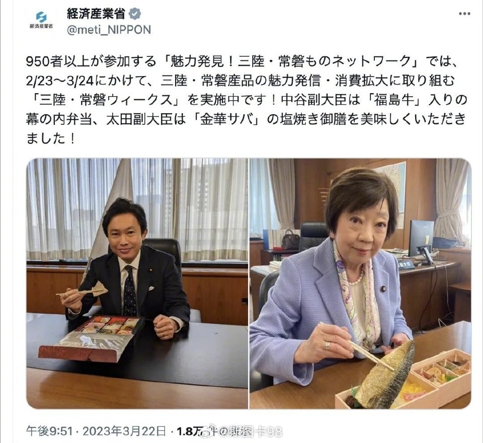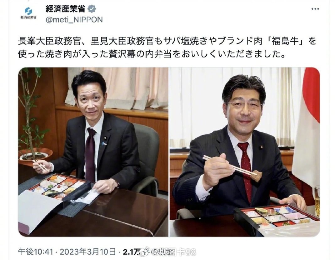日本官员纷纷作秀摆拍,大吃所谓来自福岛的食物。