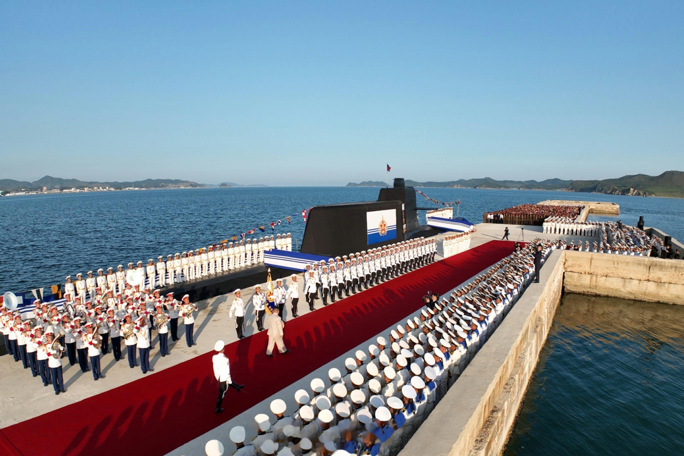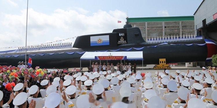 9月6日在朝鲜东海岸新浦造船厂,朝鲜新的弹道导弹核潜艇举行下水的仪式。
