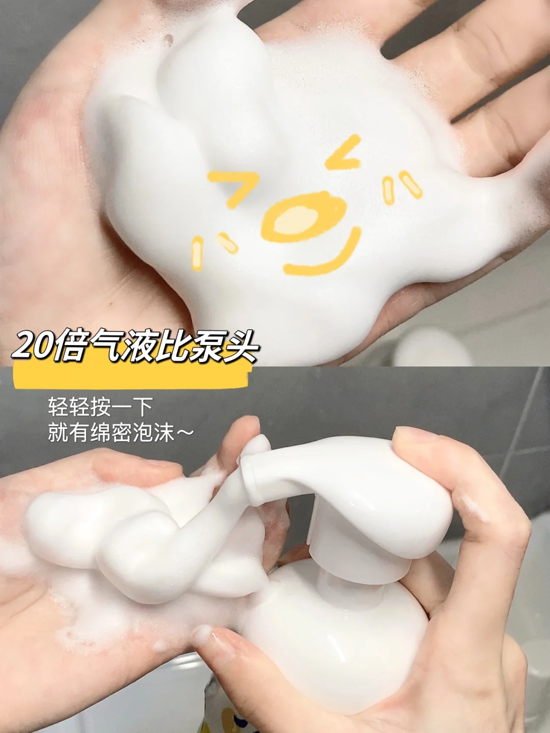 20倍气液比专研泵头设计干净又方便,轻轻一按就有丰富泡沫
