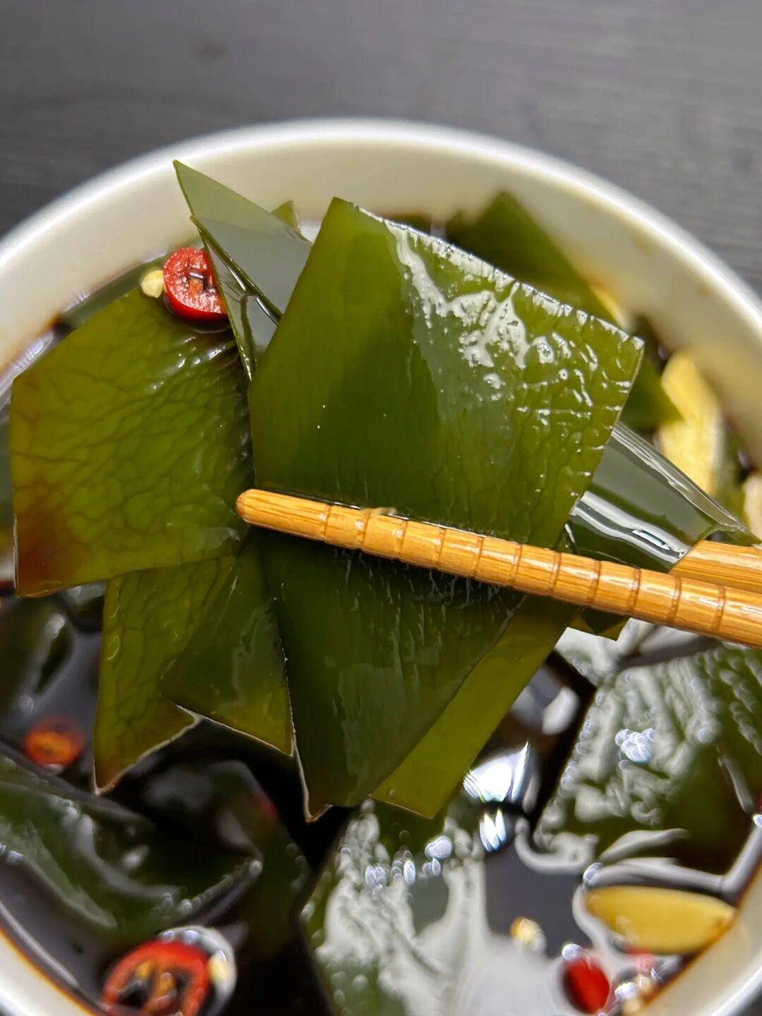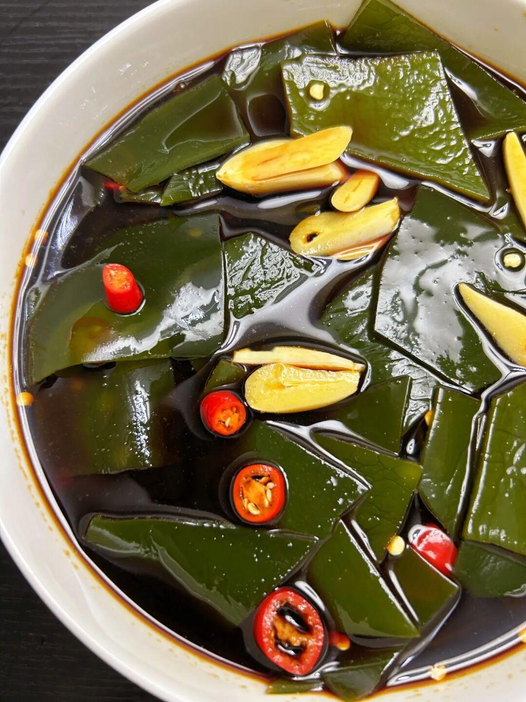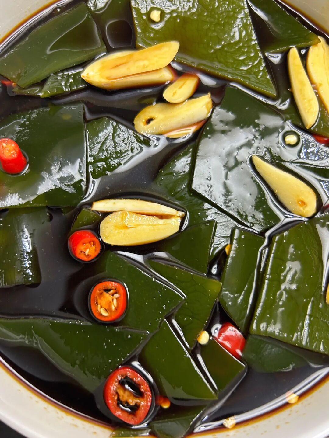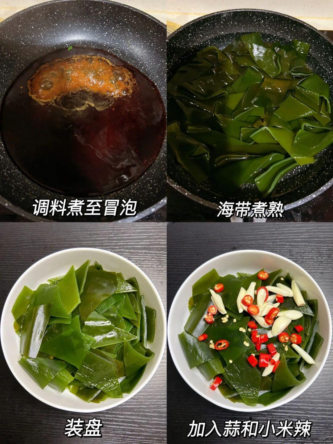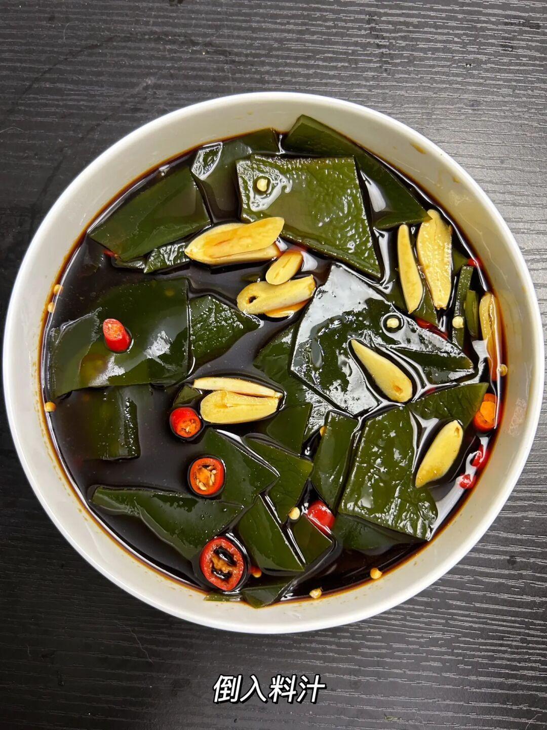 海带这么做太好吃啦!! 下饭下酒都可以! 1⃣️锅里加入6勺生抽、4勺米醋、1勺盐、1勺白糖,煮至冒泡关火 2⃣️海带煮熟过一下凉水装盘,加入蒜片和小米辣,倒入料汁 完成✅ 可以直接吃 放冰箱冷藏一晚上更好吃!