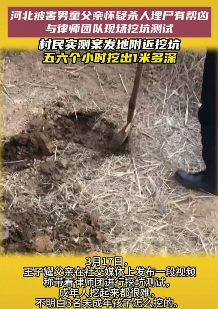 随着事件不断发酵,此案似乎有了新的疑点。3月17日,被害王同学的父亲带着律师团队,来到了藏尸地点,也就是那个废弃的蔬菜大棚,他们要进行挖坑测试。从网传视频中可以看出,藏尸地的土质并不松软,成年人挖起来都很费力。
