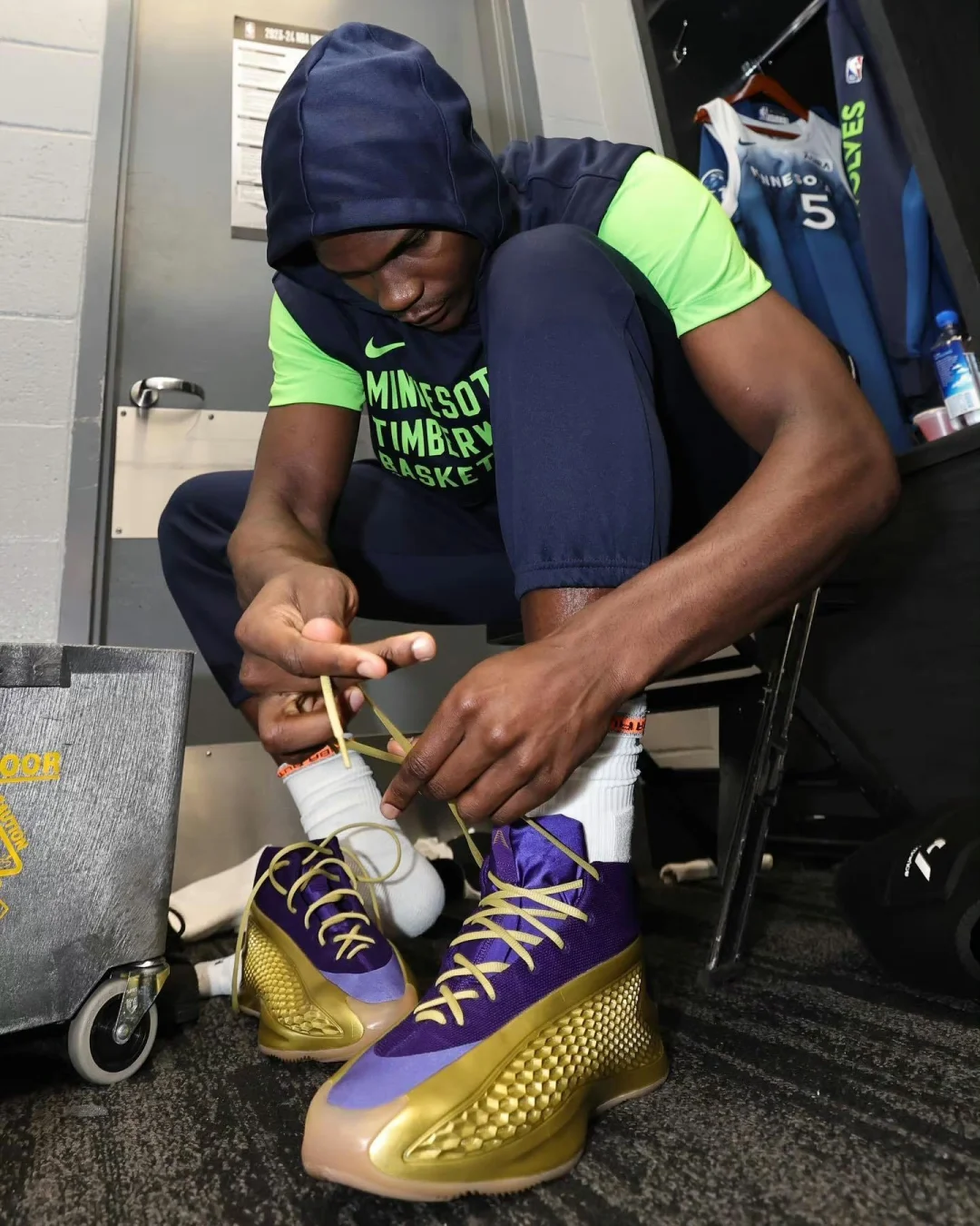 最近,华子亲自晒出 PE 配色 AE1。配色灵感来源于其本人小时候橄榄球队的队服颜色,从视频中可以看到爱德华兹当年在橄榄球队的身影。实际上脚效果跟官方素材还是有明显颜色的不同,尤其是「蚁巢」设计的鞋身,在赛场光线的照射下呈现出更闪耀的金色效果。这双 PE 配色 AE1 目前还没有市售计划。