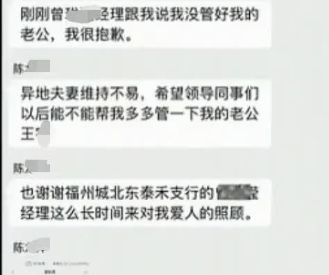 网传建行一支行女经理出轨有家室的男下属,聊天内容露骨!工作人员回复:谣言! 4月9日,网传一女士陈某某曝光自己丈夫王某被福州城北东秦禾支行曾经理特殊照顾,希望王某领导同事帮忙管一下。 陈某某随即附上了相关聊天记录。从二人聊天记录可以看出,两人关系匪浅,聊天露骨。 不过对于此事件,中国建设银行(福州城北东秦禾支行)工作人员称此事是谣言,他们行没有这个人。 真相到底如何,拭目以待。