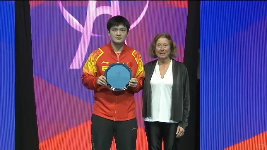 釜山世乒赛团体赛落幕,中国乒乓球队包揽男女团冠军。赛后颁奖仪式,樊振东获得本届赛事最佳男运动员奖,孙颖莎获得最佳女运动员奖。