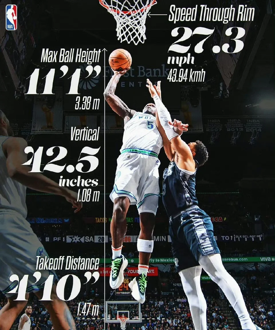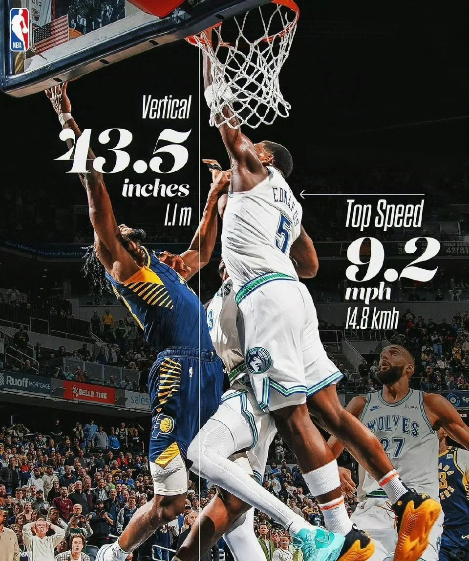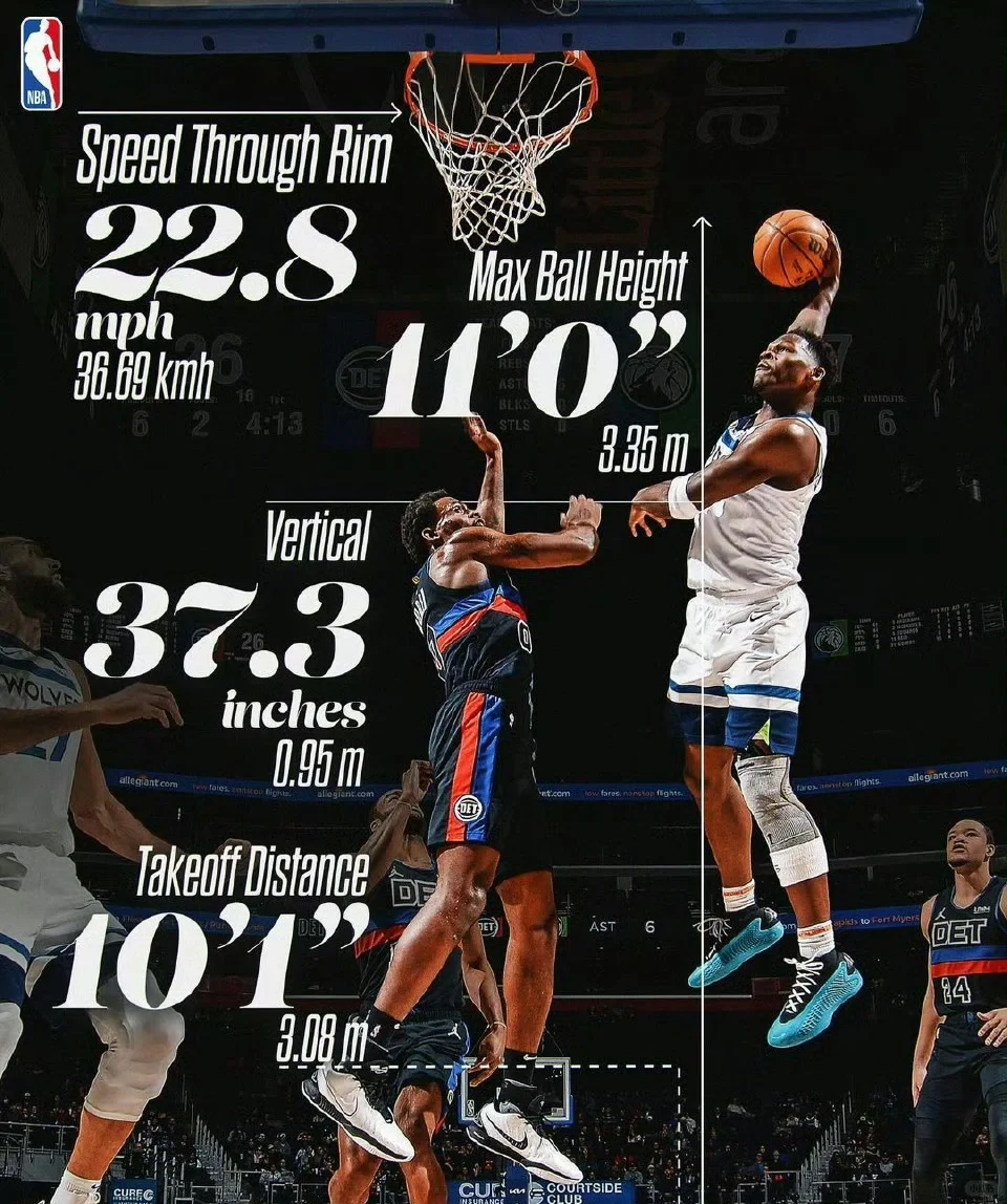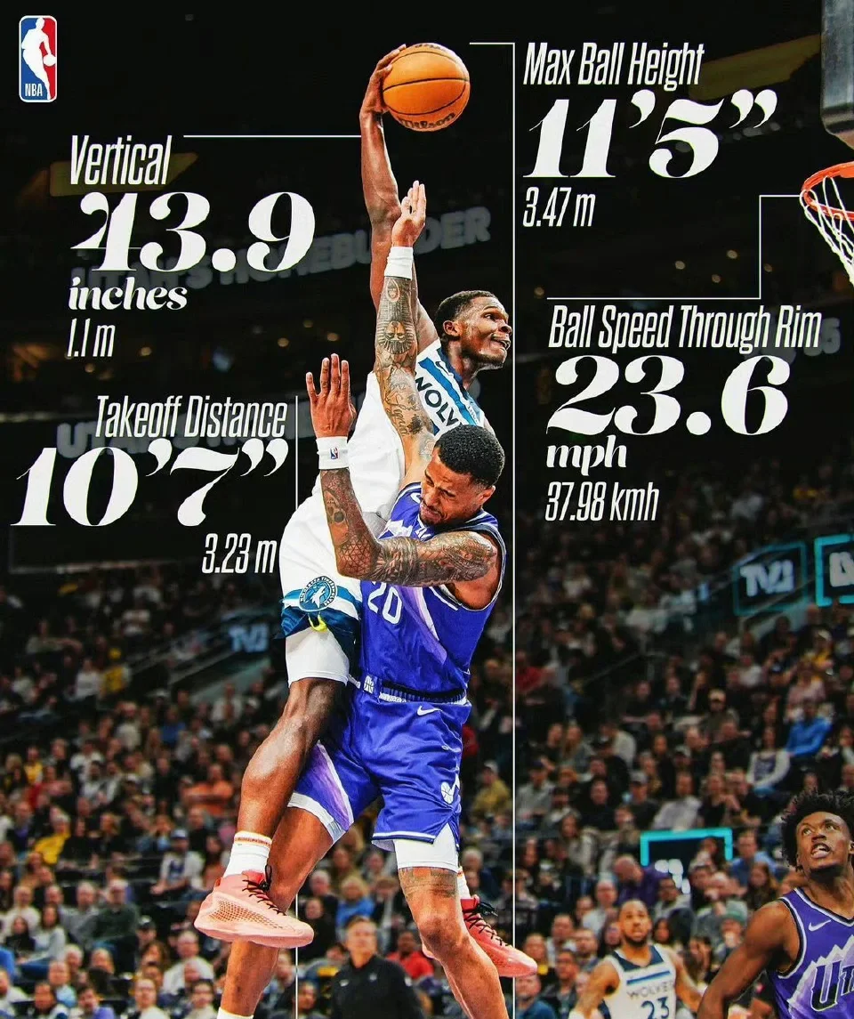 NBA官方晒出爱德华兹几次经典暴扣、封盖瞬间的惊人数据指标