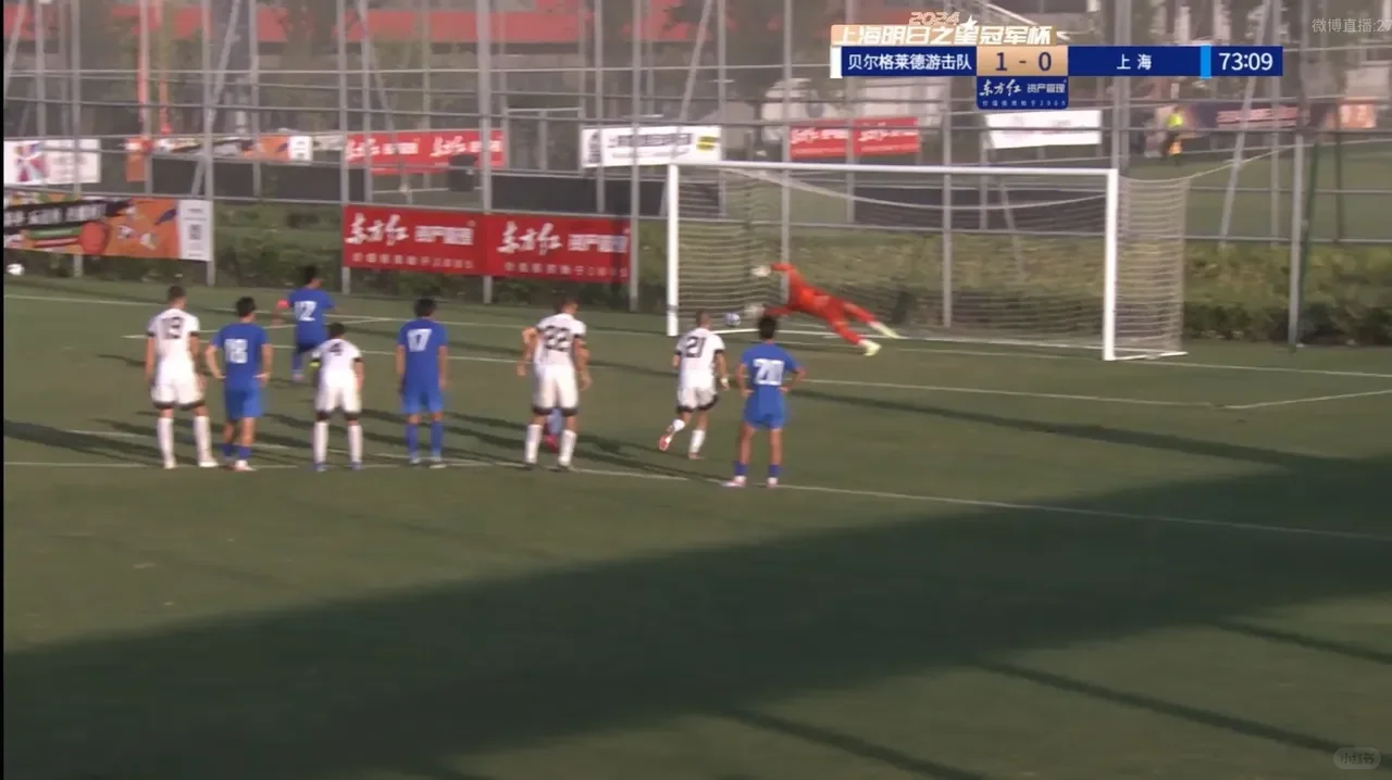 一开场,上海队就采用高位逼抢战术,让对手感到不适,在运动战中,双方互有来往,均并未占据多大的优势。不过,对手利用定位球,二点球补射,打在球员身上折射入网,率先1:0领先。但38分钟他们一球员两黄一红下场,优势来到了上海队这边。73分钟,上海队右边传中,球打在匆忙解围的防守手上,获得一个点球机会。12号队长主罚打进,改写比分1:1。