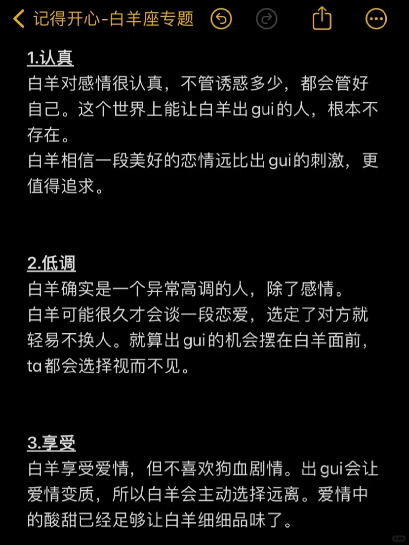 1.认真 白羊对感情很认真,不管诱惑多少,都会管好自己。这个世界上能让白羊出gui的人,根本不存在。 白羊相信一段美好的恋情远比出gui的刺激,更值得追求。 2.低调 白羊确实是一个异常高调的人,除了感情。 白羊可能很久才会谈一段恋爱,选定了对方就轻易不换人。就算出gui的机会摆在白羊面前,ta都会选择视而不见。 3.享受 白羊享受爱情,但不喜欢狗血剧情。出gui会让爱情变质,所以白羊会主动选择远离。爱情中的酸甜已经足够让白羊细细品味了。