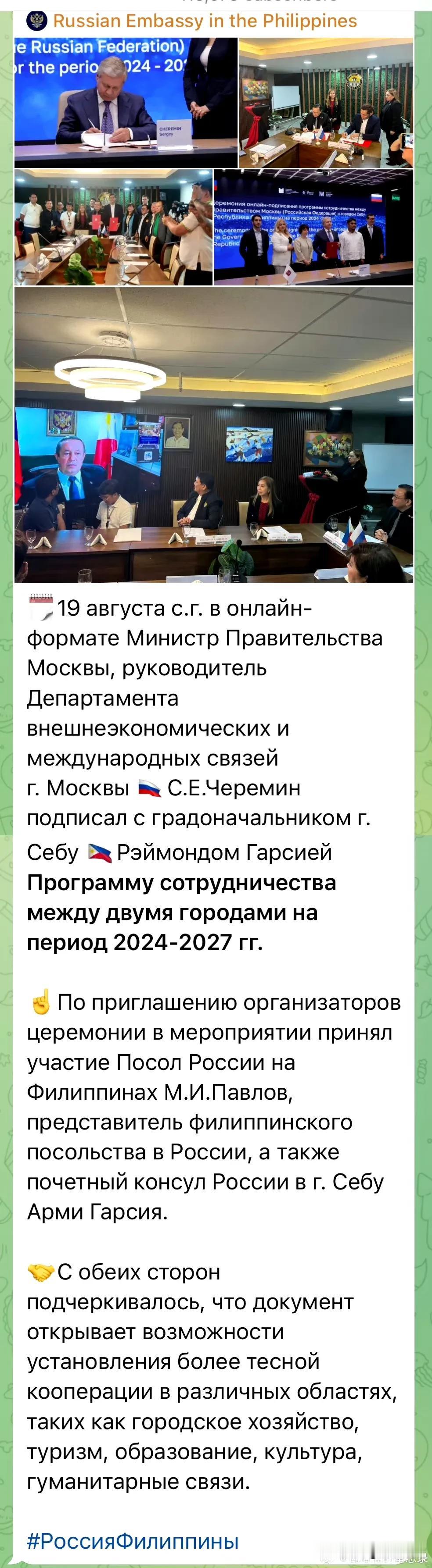 🔺给一些人一个说故事的素材 🇷🇺🇵🇭8 月 19 日,以线上形式,莫斯科市政府部长、莫斯科对外经济和国际关系局局长谢列明与宿务市市长雷蒙德-加西亚签署了《2024-2027年两市合作计划》。 🔹应仪式主办方的邀请,俄罗斯驻菲律宾大使帕夫洛夫(M.I. Pavlov)、菲律宾驻俄罗斯大使馆代表以及俄罗斯驻宿务市名誉领事阿米-加西亚(Armie Garcia)出席了此次活动。 🔹双方强调,该文件为在城市经济、旅游、教育、文化、人道主义关系等各个领域建立更紧密的合作关系提供了机会。#一起探讨俄罗斯# #近邻俄罗斯# #菲律宾#