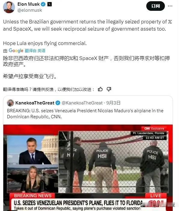 这两天巴西的卢拉和马斯克吵了起来,巴西关掉并且没收了X和SpaceX的资产,马斯克威胁巴西和总统卢拉,美国会没收巴西的资产,就像对待委内瑞拉马杜罗一样。卢拉说你是谁啊,你是一个商人,你不会好好讲话啊,不能好好尊重巴西的政治和法律啊。 资本就是这样,当它膨胀到一定程度,贪婪的本性不会让它们懂得适可而止,而是一定会向金融之外的政治伸出黑手。 马斯克借题发挥,把他和巴西的纠纷跟美委矛盾硬扯在一起,说美国也应该像对付委内瑞拉一样对付巴西。 这些是非且不论,美国如果想扣留巴西总统的飞机,肯定不像对委内瑞拉那么容易。巴西好歹也是个大国。#聊聊全球大事# #全球大事一起侃# #国际大事深度聊# #委内瑞拉谴责美国扣押委总统专机# #巴西总统#