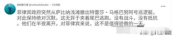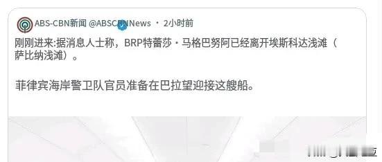 今早(15日),菲律宾海警9701舰离开非法滞留的中国仙宾礁后的媒体反应: 1.菲律宾权威大媒体ABS-CBN未具名证实,菲海警将在巴拉望基地码头迎接9701舰归来; 2.菲律宾著名大媒体GMA新闻报道说已与菲海警求证确认此事为真; 3.SPSPI(南海战略态势感知海外账号)发布证实信息; 4.美国爸爸网友狂怒指责菲律宾撤船乃投降懦夫行为。#菲媒阴谋论# #支持中国渔船。# #南海国际局势# #支援南海,# #菲律宾#