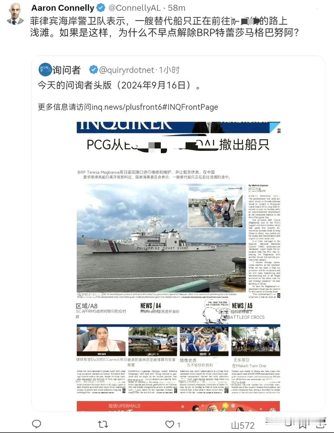菲官员称菲船员喝了一个多月的雨水和空调水——菲律宾海岸警卫队发言人Jay Tarriela就BRP Teresa Magbanua号试图侵占中国仙宾礁未果后撤离召开记者发布会,根据ABS-CBN News记者的发出的文字报道: 1、由于海水淡化系统受损,BRP Teresa Magbanua号船员已经喝了一个多月的雨水和空调水; ➤既然如此那干嘛在一个雨天撤回呢,多好的攒雨水的机会。下面视频是BRP Teresa Magbanua号拍摄的跟踪其撤离中国海警船,菲律宾海岸警卫队借此说明天气恶劣。 2、强调菲律宾不会放弃也没有失去仙宾礁,将会继续在仙宾礁巡逻并维持存在;#仁爱礁事件观察# #菲船撤离# #菲律宾后# #撤离仙宾礁菲船数人被担架抬上岸#