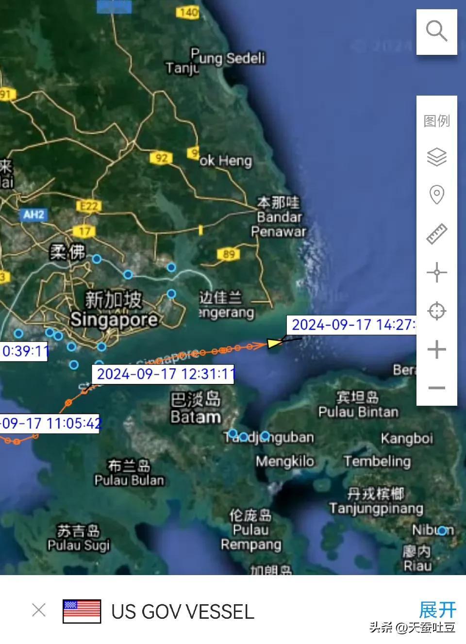 根据AIS信号显示,美国海军罗斯福号航母(CVN-71)径直通过新加坡海峡,即将进入南海(图1),途径樟宜海军基地时并未停留。 同行的丹尼尔·井上号驱逐舰(DDG-118)在樟宜港口停靠3个半小时等待罗斯福号(图2)#探寻南海奥秘# #美国航母动态# #航母全速航行#