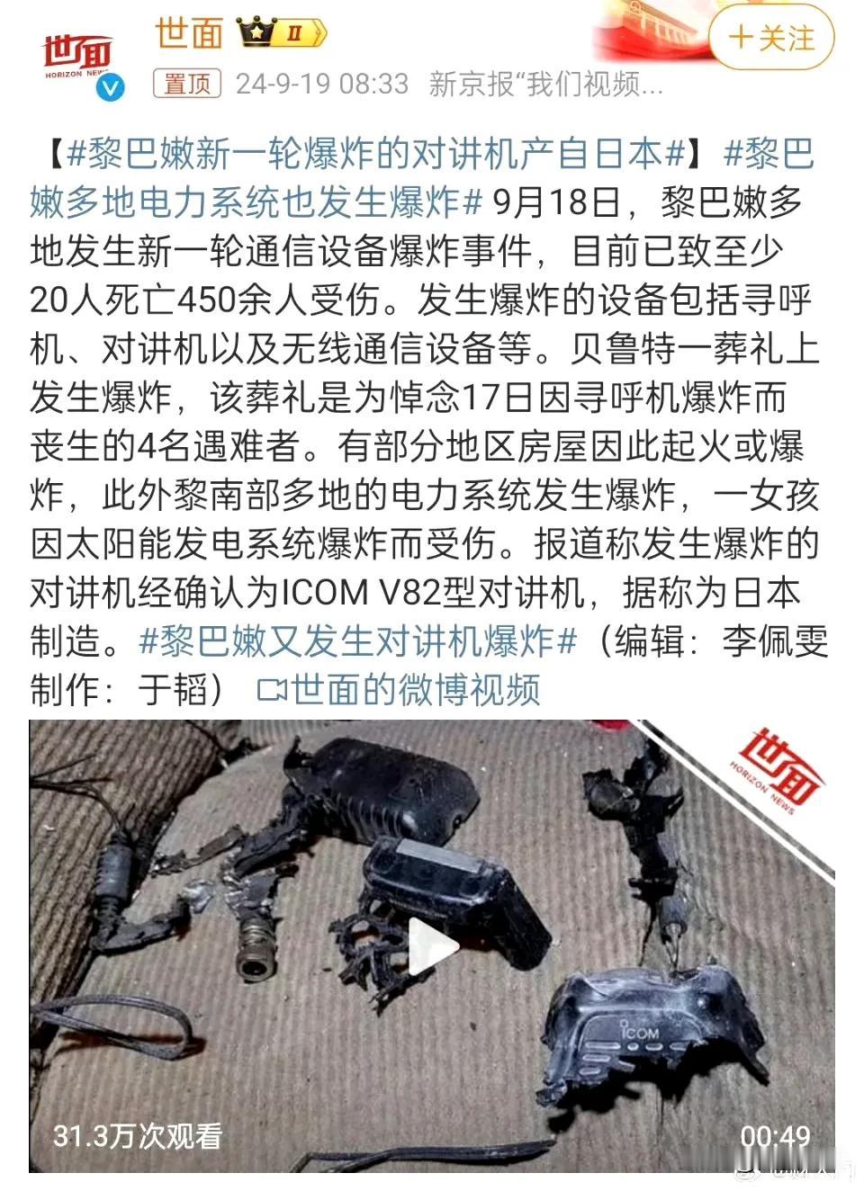 以色列到底计划了多久,才能达到目前这种恐怖效果,继17日寻呼机爆炸后,对讲机、车载收音机,部分手机以及其他通信设备等,也于18日起在黎巴嫩各地陆续发生爆炸。 寻呼机、对讲机、太阳能发电系统也爆炸……这么看来绝对是准备了很长时间的一次精心策划的袭击啊,这是对全世界的示威啊,这么下去就看谁心狠,谁不择手段了,要乱套。#巴以之殇共话# #再谈巴以纷争!# #黎巴嫩寻呼机爆炸与网络攻击有关吗# #黎巴嫩首都大爆炸#