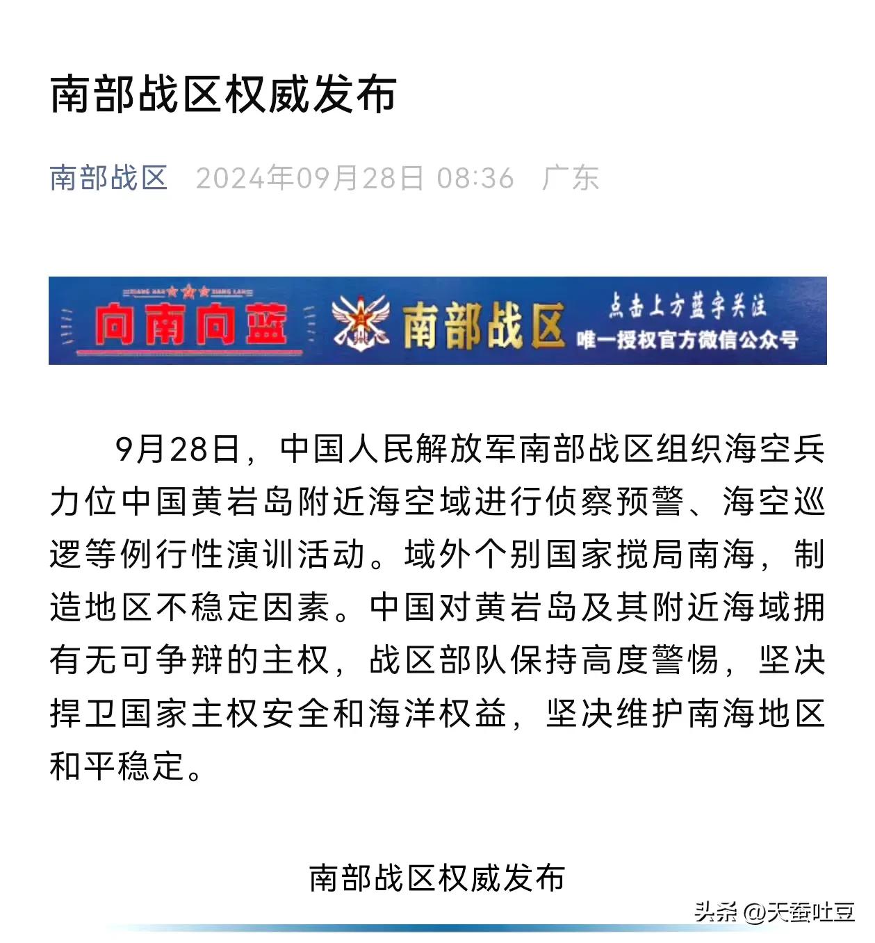 菲律宾武装部队发布声明称,9月28号,美国、日本、澳大利亚、新西兰和菲律宾在所谓的菲律宾专属经济区进行多边海上合作活动。 参演舰机包括,菲律宾海军安东尼奥·卢纳号护卫舰(FF-151)、埃米利奥 ·辛托号护卫舰(PS-35),日本海上自卫队涟波号驱逐舰(DD-113),美国海军霍华德号驱逐舰(DDG-83),新西兰皇家海军奥特亚罗瓦号补给舰(A11)和澳大利亚皇家海军悉尼号驱逐舰(DDGH-42),以及澳大利亚空军1架P-8A反潜巡逻机,根据P-8A的飞行活动,演习地点就位于黄岩岛附近的海空域。 同一天,南部战区在黄岩岛附近海域组织海空演训。#菲律宾舰队# #多国军舰# #外舰入侵# #菲国海岸防卫队# #菲律宾军事热点#
