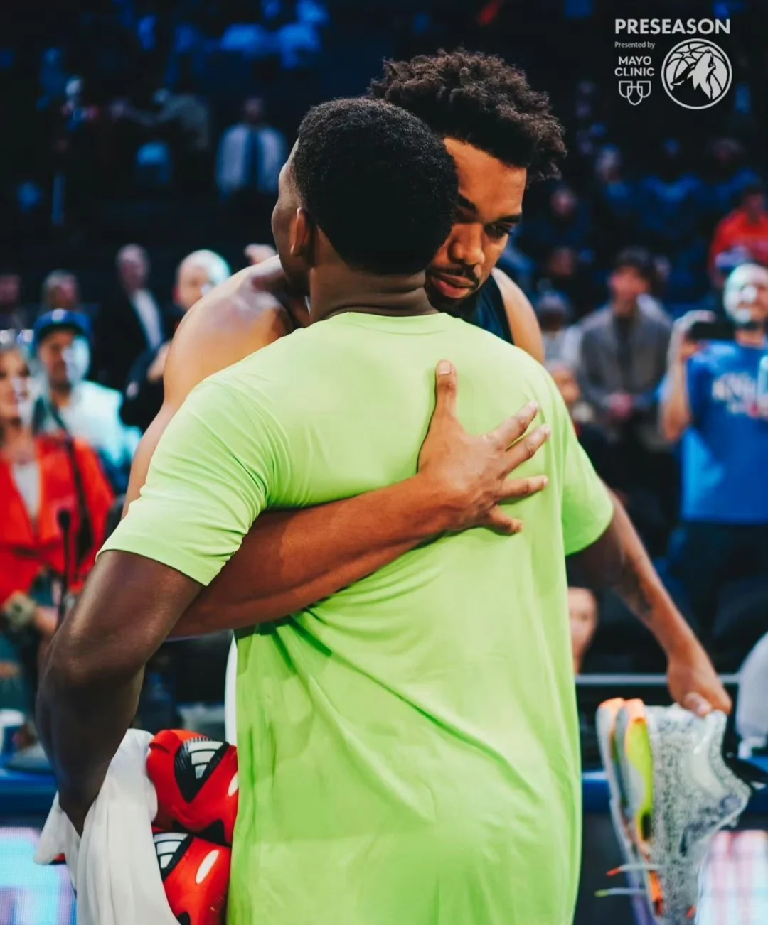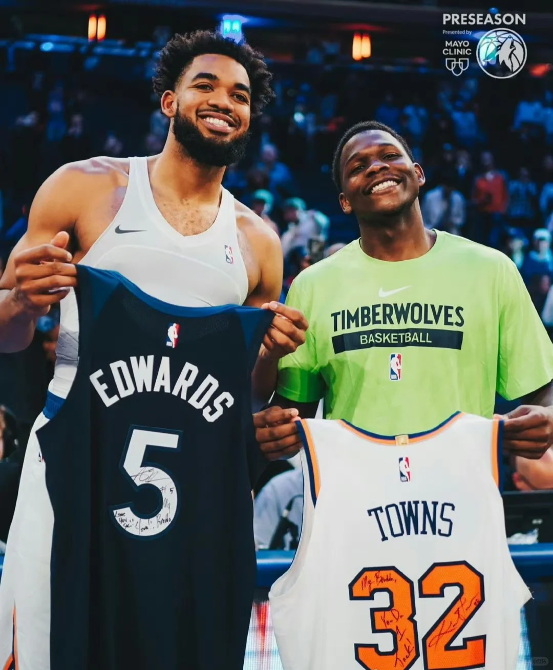 季前赛第三场,森林狼110:115不敌尼克斯,赛后华子和唐斯相互拥抱互换球衣,KAT × ANT一辈子好哥们