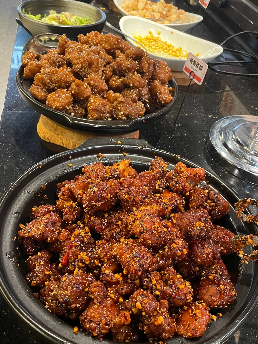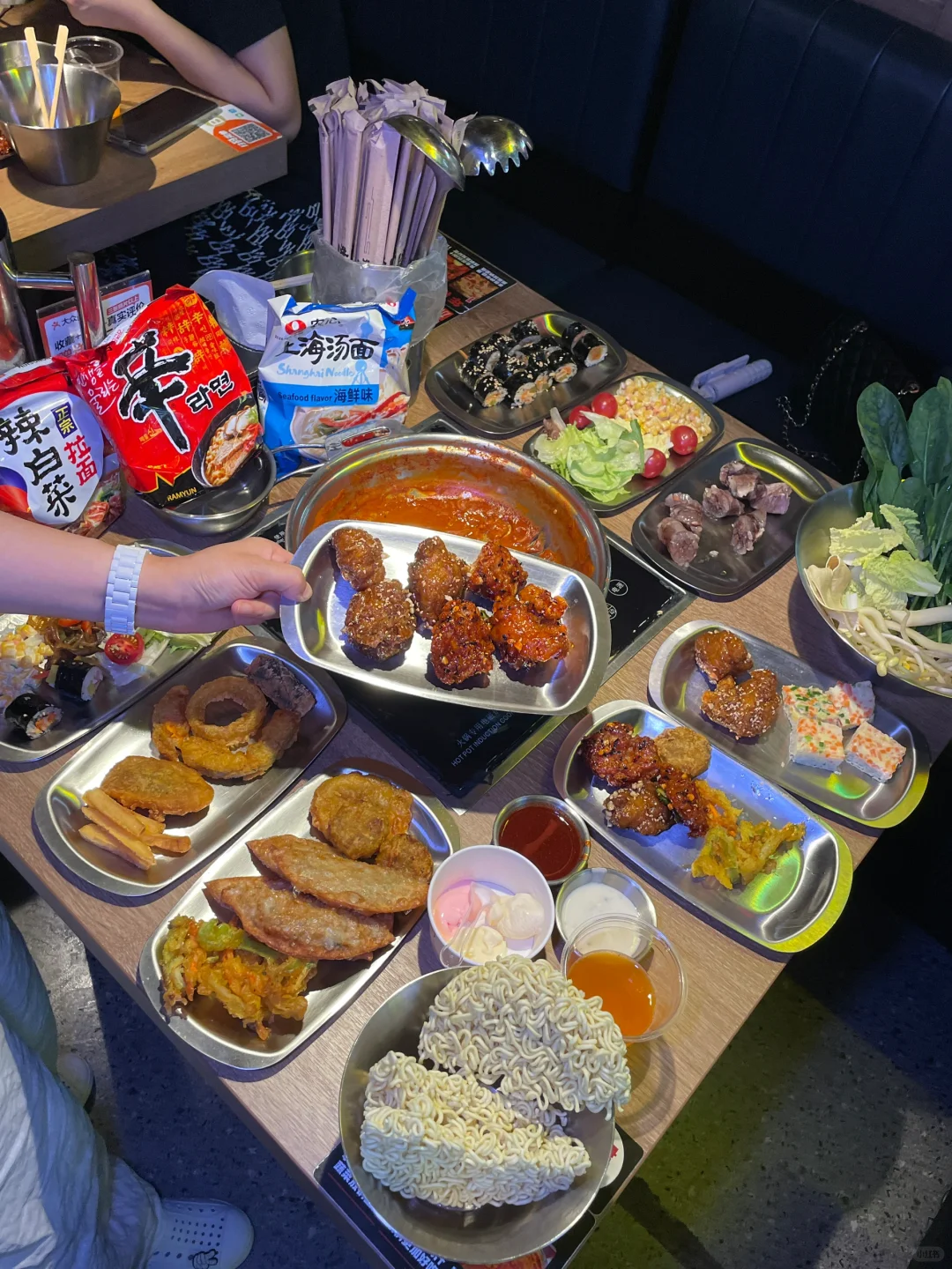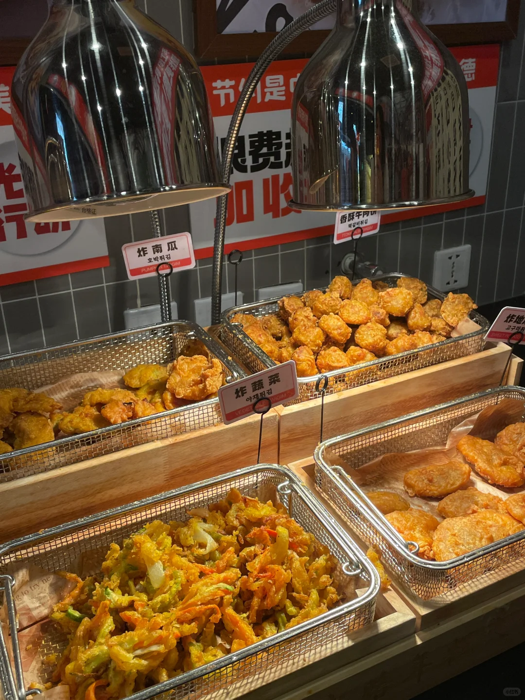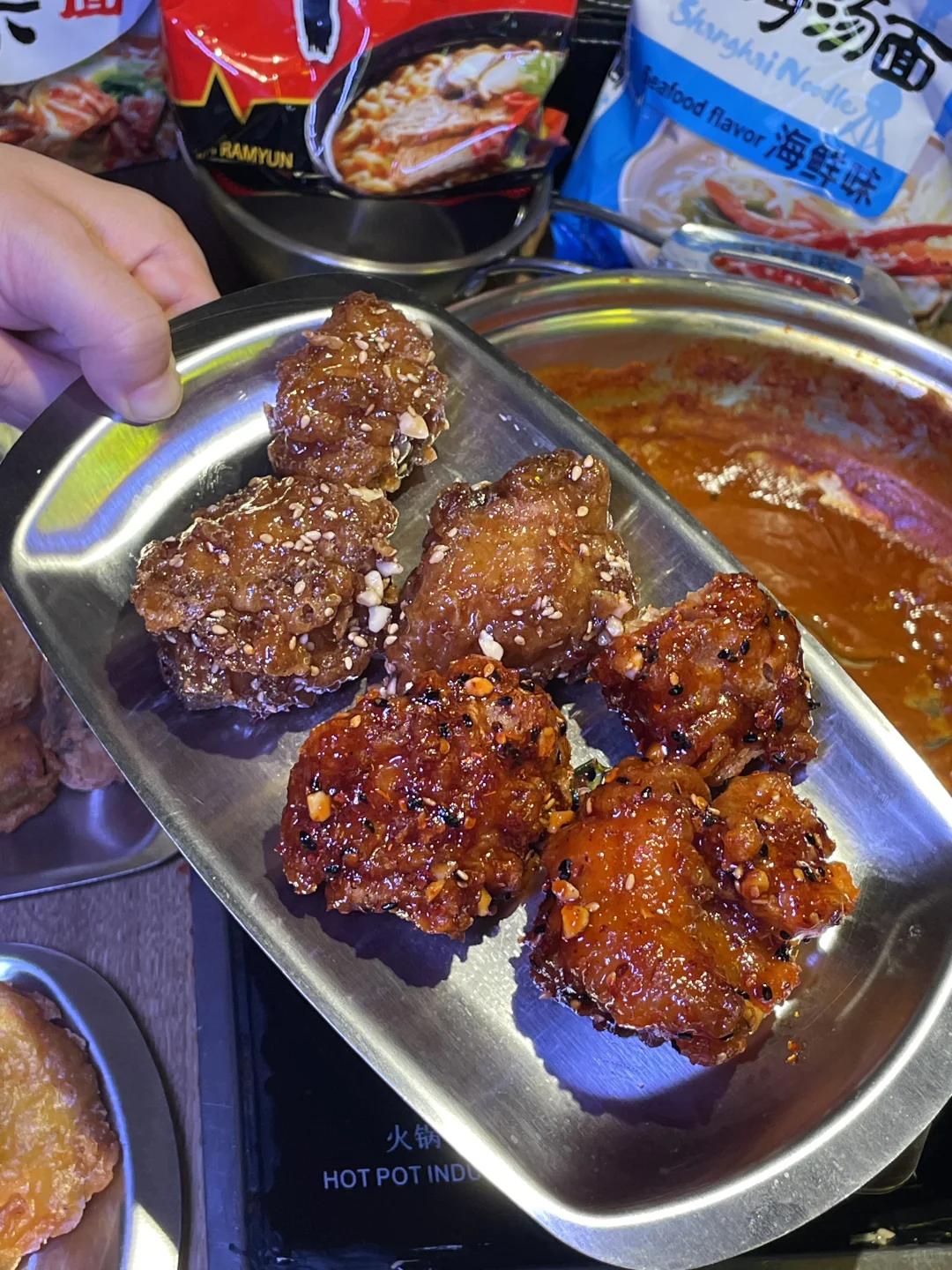 一进门就看到各种菜品摆放整齐,品种可太多了,涮锅的蔬菜、鸡蛋、粉条、拉面,还有各种韩式小吃,韩式凉菜和炸物,其中两种口味的炸鸡都是我的最爱,每一块都裹满了秘制酱料,一种是酸甜开胃的,一种是香辣可口的。🍗