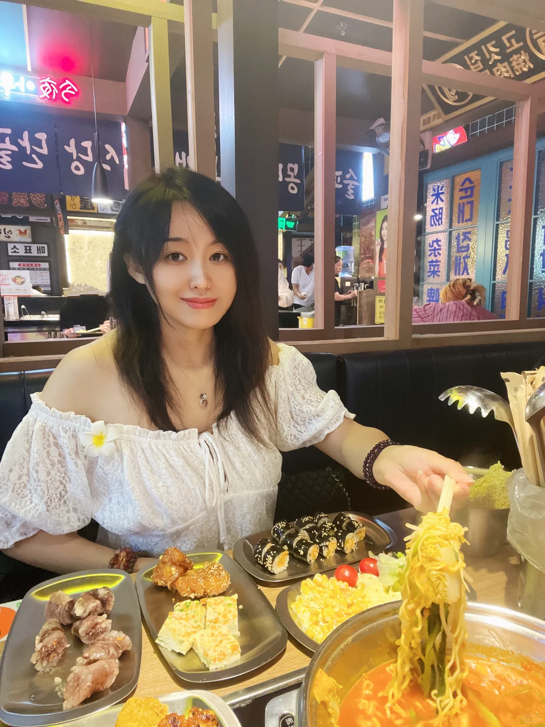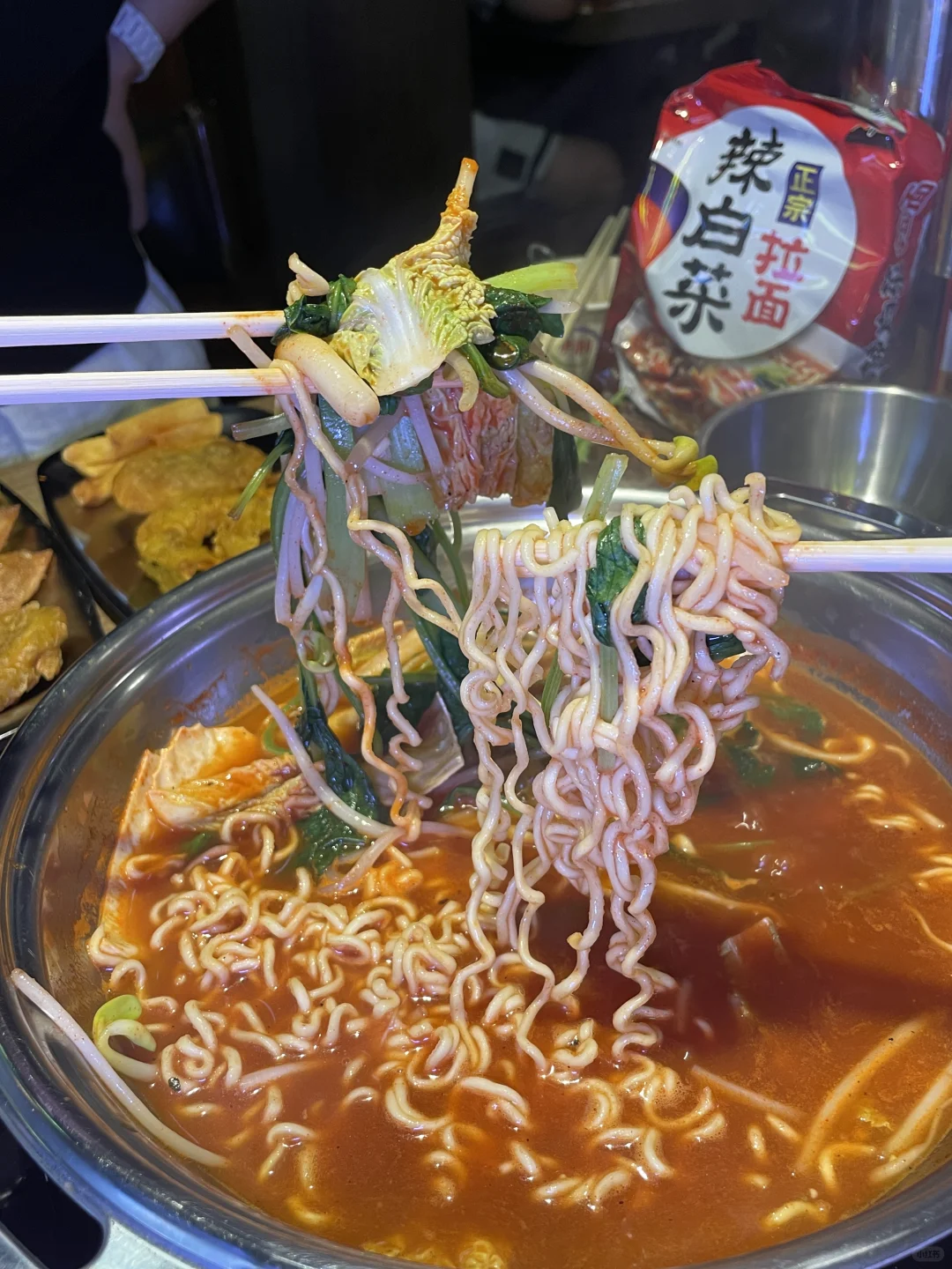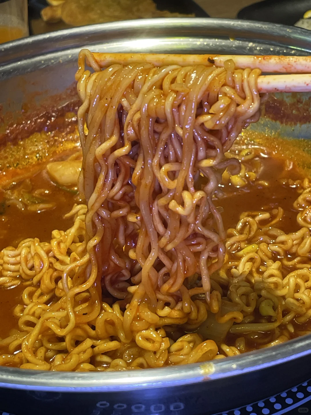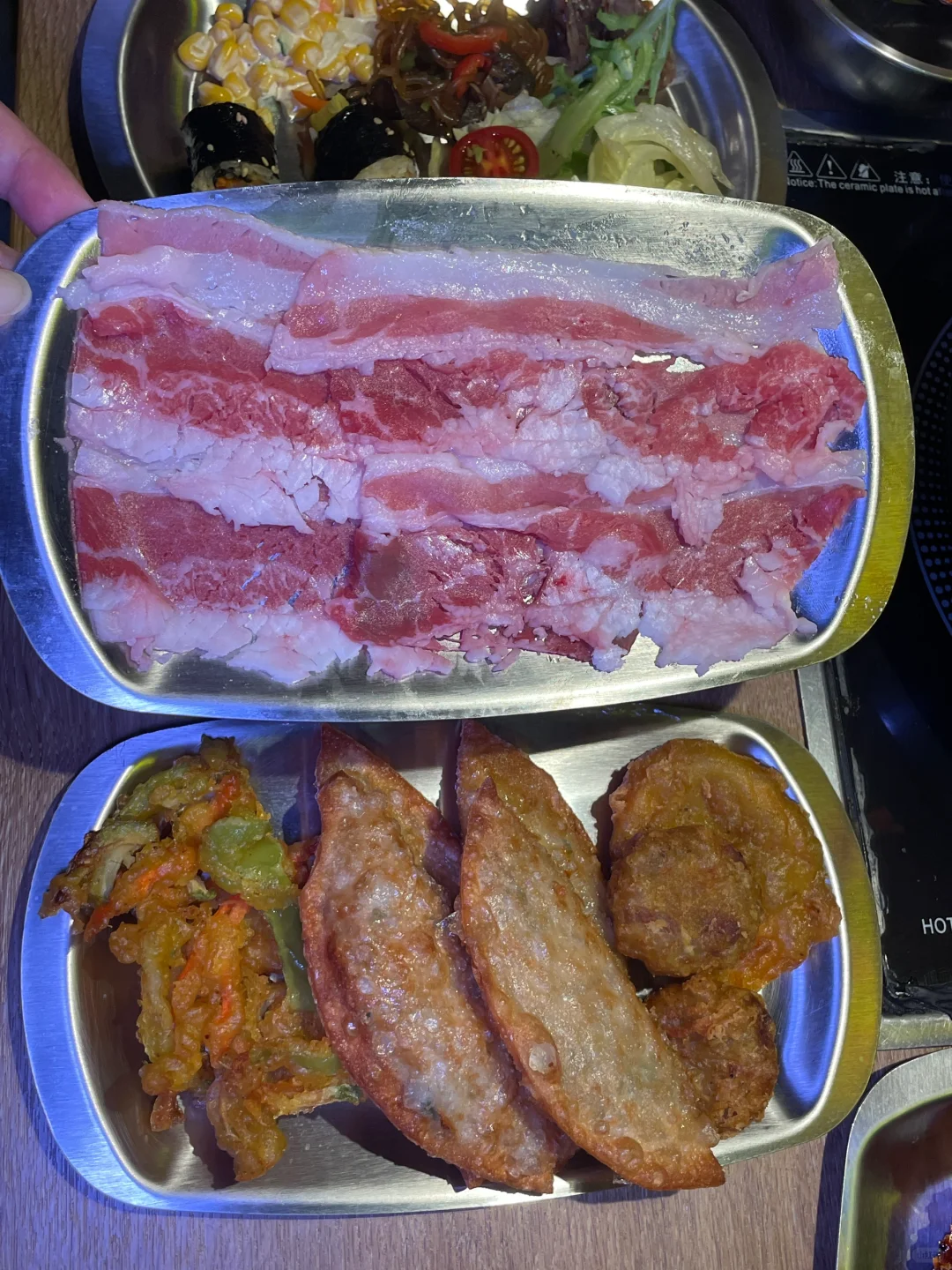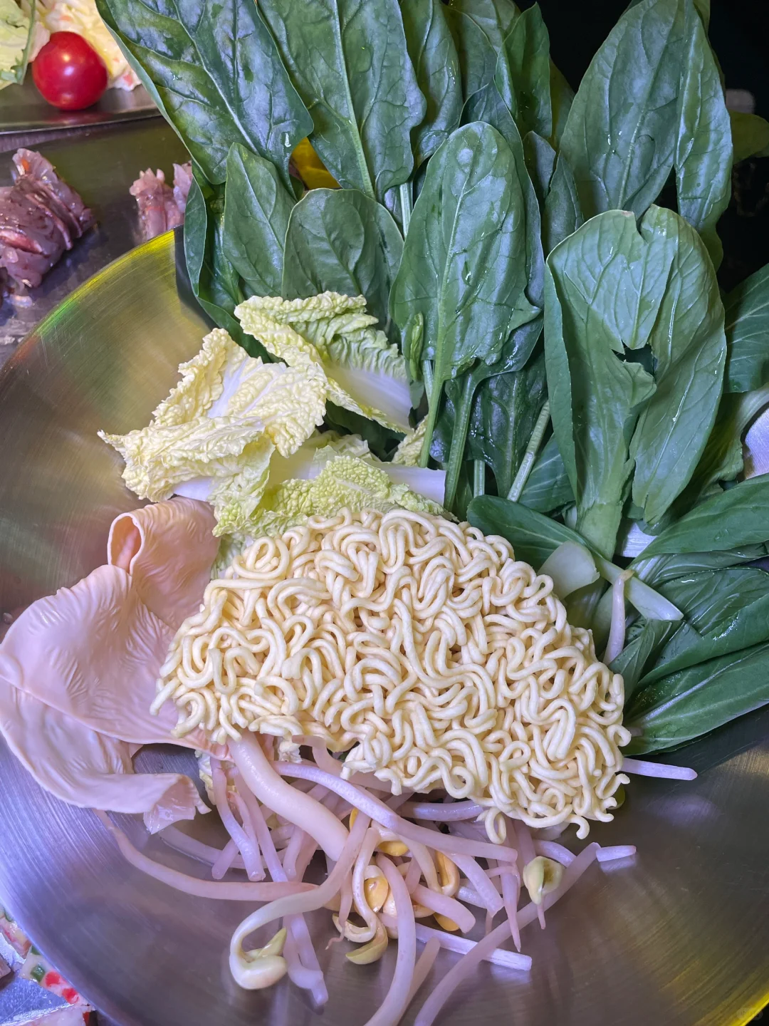 一进门就看到各种菜品摆放整齐,品种可太多了,涮锅的蔬菜、鸡蛋、粉条、拉面,还有各种韩式小吃,韩式凉菜和炸物,其中两种口味的炸鸡都是我的最爱,每一块都裹满了秘制酱料,一种是酸甜开胃的,一种是香辣可口的。🍗