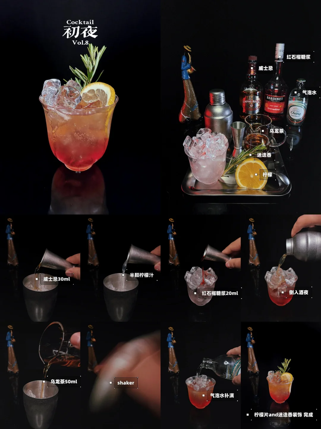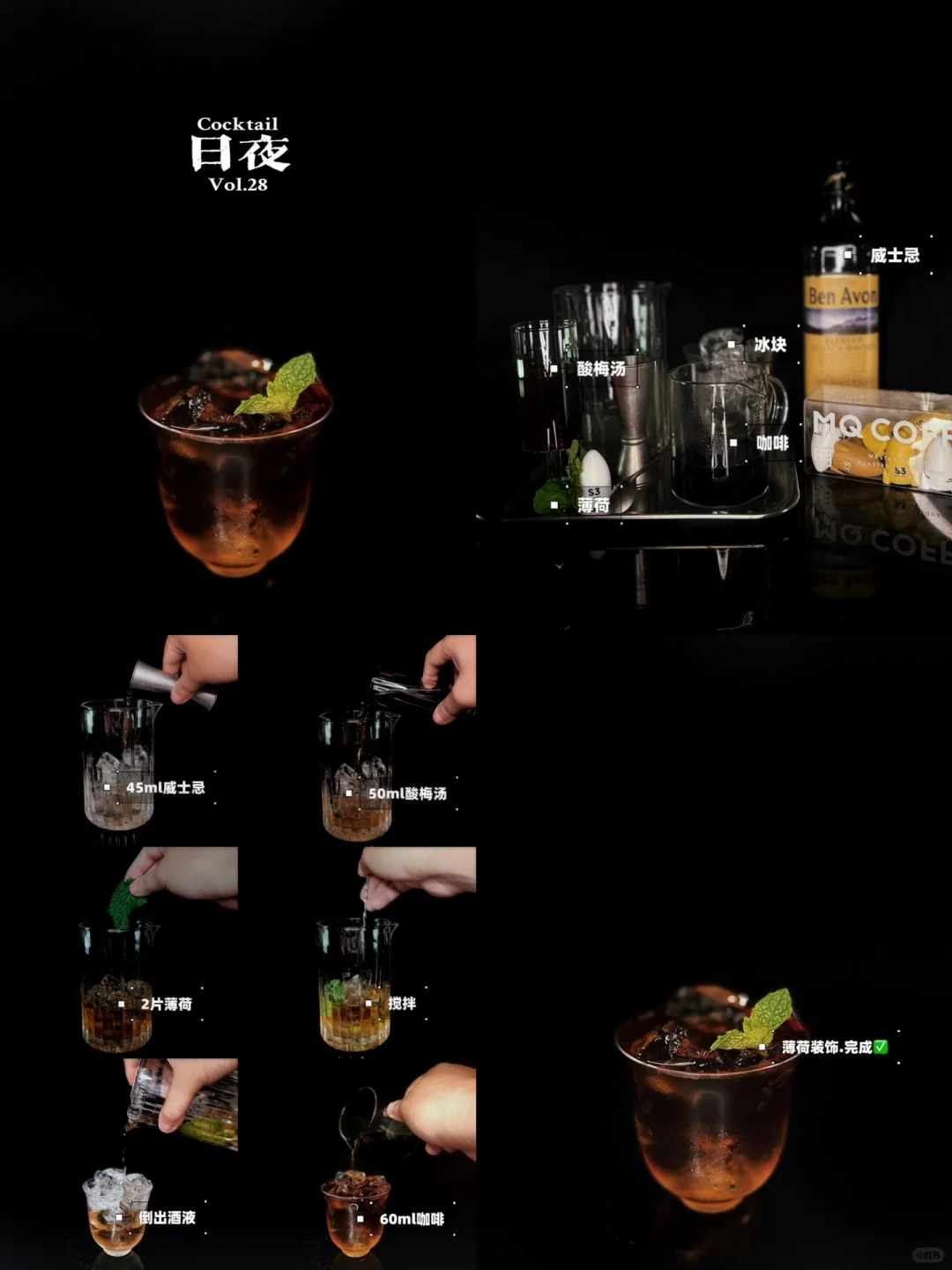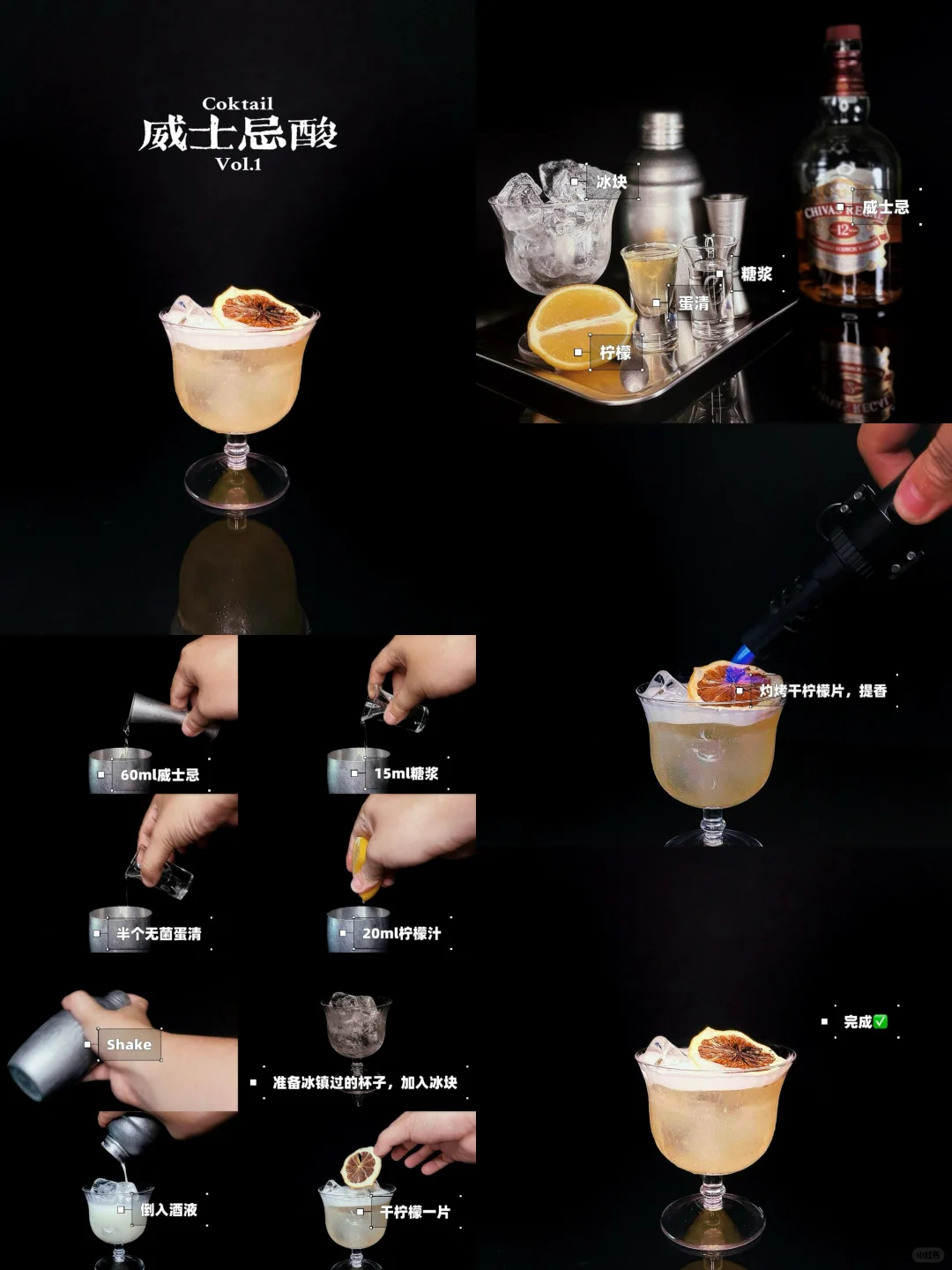 “威士忌不能治愈的事情,就无法治愈。 “whatwhiskey will not cure, there is no curefor.” - 月亮与六便士|满地六便士,他却抬头看起了月亮 配方Formula 威士忌——————40ml 菠萝糖浆—————20ml 蓝橙力娇酒————30ml 气泡水-—————90ml 柠檬汁-—————15ml - 繁华|繁华落尽,皆是过眼云烟 配方Formula 威士忌——————45ml 玫瑰糖浆-—————15ml 葡萄柚汁-—————90ml 柠檬汁——————半颗 - 经典 | 威士忌酸Whiskey Sour 配方Formula 威士忌————60ml 柠檬汁————20ml 糖浆-————15ml 蛋清-————半个无菌蛋清 干柠檬————1片 - 日夜 | 咖啡与酒,成年人的日夜 配方Formula 威士忌——————45毫升 咖啡-——————60毫升 酸梅汤——————50毫升 薄荷-——————3片 - 前夫 | 男儿爱后妇,女子重前夫 配方Formula 杏仁力娇酒———20毫升 威士忌————50毫升 绿豆汤————50毫升 柠檬汁————10毫升 蜂蜜—————10毫升 - 初夜|寒夜客来茶当酒 竹炉汤沸火初红 配方Formula 乌龙茶————50毫升 红石榴糖浆———20毫升 威士忌————30毫升 气泡水————补满量 迷迭香————1根 柠檬—————半颗 六种威士忌微醺特调,六种快乐[doge]看来试试!