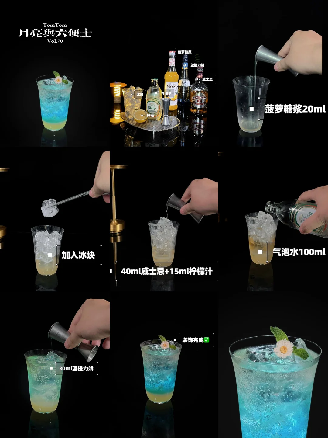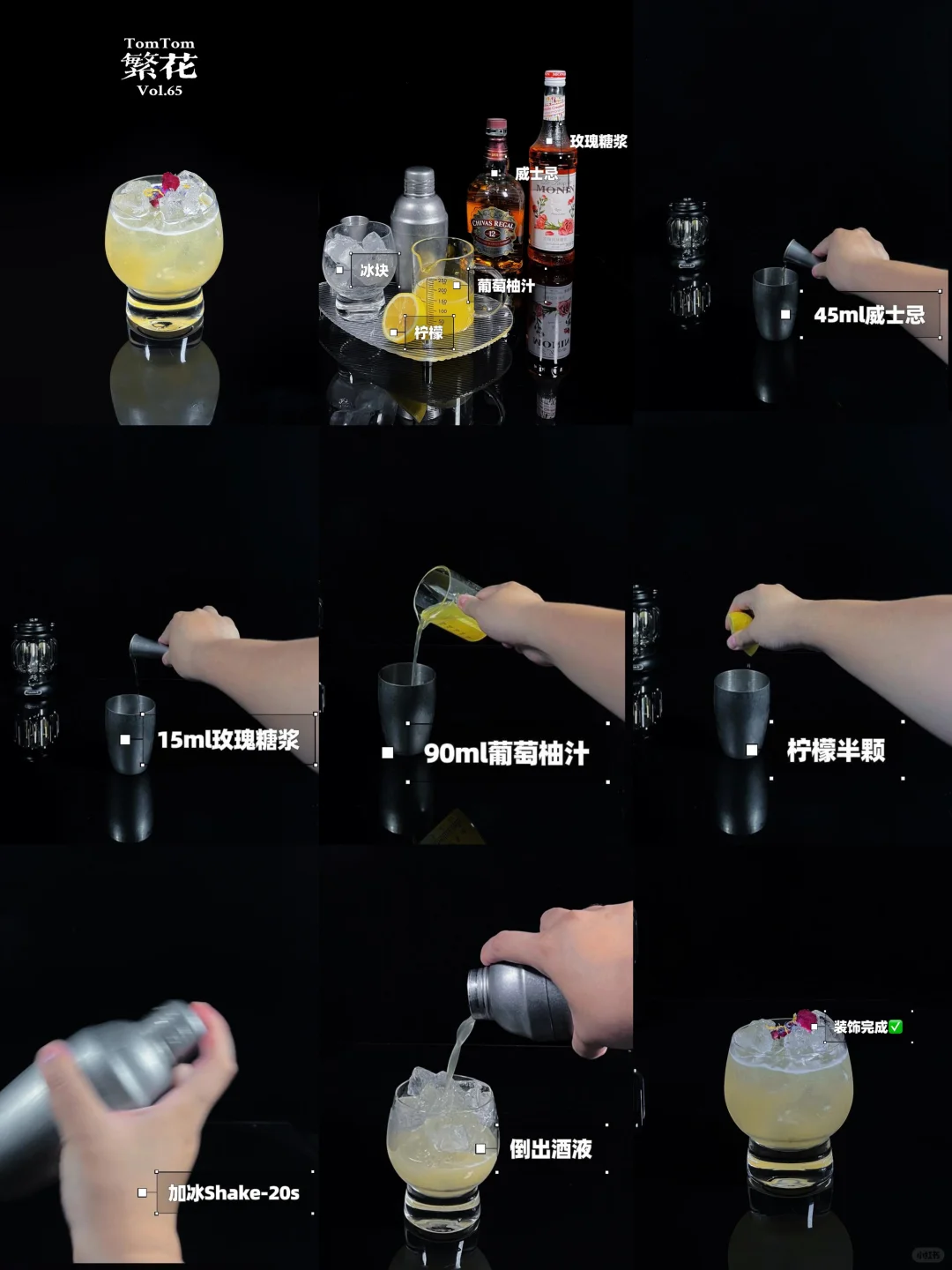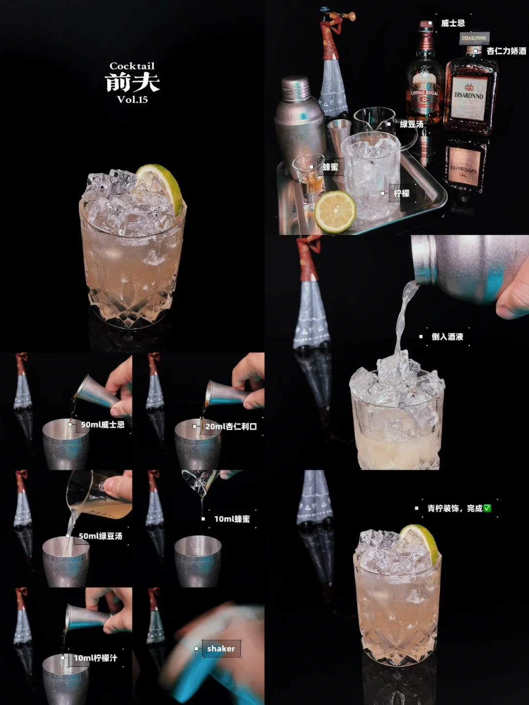 “威士忌不能治愈的事情,就无法治愈。 “whatwhiskey will not cure, there is no curefor.” - 月亮与六便士|满地六便士,他却抬头看起了月亮 配方Formula 威士忌——————40ml 菠萝糖浆—————20ml 蓝橙力娇酒————30ml 气泡水-—————90ml 柠檬汁-—————15ml - 繁华|繁华落尽,皆是过眼云烟 配方Formula 威士忌——————45ml 玫瑰糖浆-—————15ml 葡萄柚汁-—————90ml 柠檬汁——————半颗 - 经典 | 威士忌酸Whiskey Sour 配方Formula 威士忌————60ml 柠檬汁————20ml 糖浆-————15ml 蛋清-————半个无菌蛋清 干柠檬————1片 - 日夜 | 咖啡与酒,成年人的日夜 配方Formula 威士忌——————45毫升 咖啡-——————60毫升 酸梅汤——————50毫升 薄荷-——————3片 - 前夫 | 男儿爱后妇,女子重前夫 配方Formula 杏仁力娇酒———20毫升 威士忌————50毫升 绿豆汤————50毫升 柠檬汁————10毫升 蜂蜜—————10毫升 - 初夜|寒夜客来茶当酒 竹炉汤沸火初红 配方Formula 乌龙茶————50毫升 红石榴糖浆———20毫升 威士忌————30毫升 气泡水————补满量 迷迭香————1根 柠檬—————半颗 六种威士忌微醺特调,六种快乐[doge]看来试试!