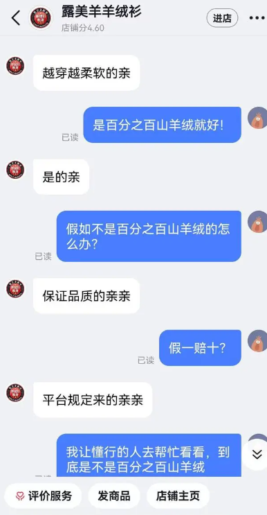 但这一试穿,感觉就不对劲儿了,这哪是羊绒衫,扎皮肤扎得厉害,正常的羊绒衫哪会这样呢?他就赶紧问商家咋回事。然而商家的回复却是说“越穿越柔软”,还特别理直气壮的表示可以去专业的检测部门做质检。