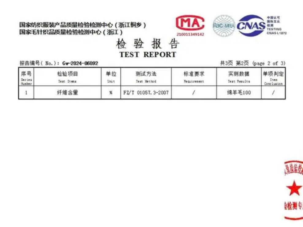 而最后检验出来的结果还真是让出乎意料,这两件所谓的“羊绒衫“其实就是羊毛衫,监测数据明确的显示着”绵羊毛100%”。