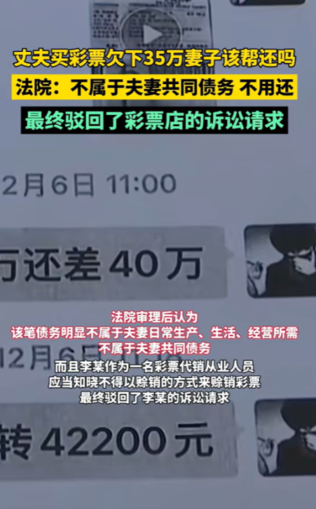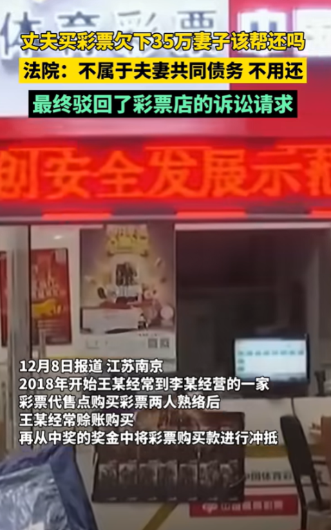 (来源:阎良区人民检察院2024年12月9日关于《丈夫买彩票欠下35万妻子该帮还吗?法院:不属于夫妻共同债务,不用还!》的报道)