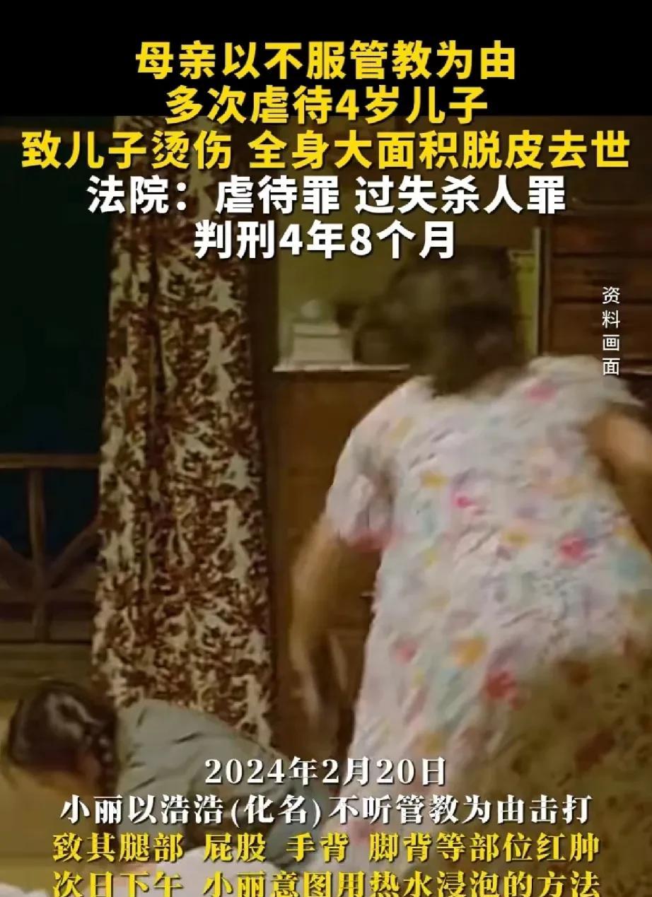骇人听闻!宝妈小丽因4岁孩子(浩浩)不好好吃饭,不好好睡觉、不服从管教等小错误,经常用衣架、铝合金条击打孩子身体,致其孩子身体多部位出血、红肿,最后以不恰当的处理方式致孩子死亡。 值得一提的是,上述宝妈小丽并非后妈,而是浩浩如假包换的亲生母亲。 2024年2月20日这天,浩浩再次“犯错",宝妈小丽不由分说对孩子又是一顿暴揍,致其腿部、屁股、手背、脚背等部位出现红肿。 由于出手太狠,浩浩身上的伤迟迟不消肿。 为了消肿,小丽用起了自己的土方法,直接将浩浩强行按在热水中浸泡。 在浸泡的过程中,浩浩多次闹太汤,但是小丽并未理会。 直到20分钟后,小丽发现孩子手部、小腿、生殖器官周围皮肤大面积脱皮,才将浩浩抱出。 出现这种情况,大多数家长都会第一时间将孩子送医治疗,但是小丽并没有这么做,而是简单的给孩子涂抹红霉素软膏了事。 然而这些补救措施都是徒劳的,没多久,浩浩的手脚开始变的冰凉,意识变得模糊。 然而愚蠢的小丽以为孩子感冒发冷,又试图用电吹风给孩子暖手暖脚,致使浩浩错过了最佳黄金治疗时间。 最终浩浩因体表暴力致伤后,又因烫伤致低血容量性休克而死亡。 最后法院以虐待儿童罪,过失致人死亡罪,判处小丽有期徒刑4年零8个月。