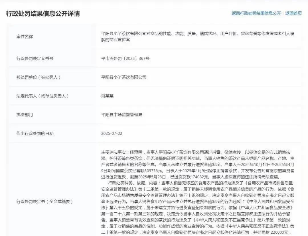 罚22万!柴怼怼这小子之前满世界宣传自己诚不欺客,是啥就是啥,没想到这么离谱,把猪草当成茶饮来卖。 据极目新闻7月25日消息,柴怼怼因售卖假茶饮致多名消费者身体不适,被市监局处罚22万。 经查,柴怼怼将农产品、野草、野花、树根、猪草宣传成中草药,在直播间采用不同话术,声称独立配方,专病防治,什么子宫肌瘤、尿结石都不在话下。 但实际上这些伪茶饮都是统一配方,甚至包括没有炮制的有毒苍耳子,致不少消费者身体不适。 7月22日,平阳县市场监督管理局对柴怼怼名下小丫茶饮有限公司作出行政处罚公示,认定该公司对商品性能、功能、质量、销售状况、用户评价、荣誉等方面存在虚假宣传,责令该公司立即停止上述违法行为,并处罚金22万元。 这小子以前满脸仁义道德,没想到用野花野草忽悠家人们,怼天怼地把自己怼了个大跟头!